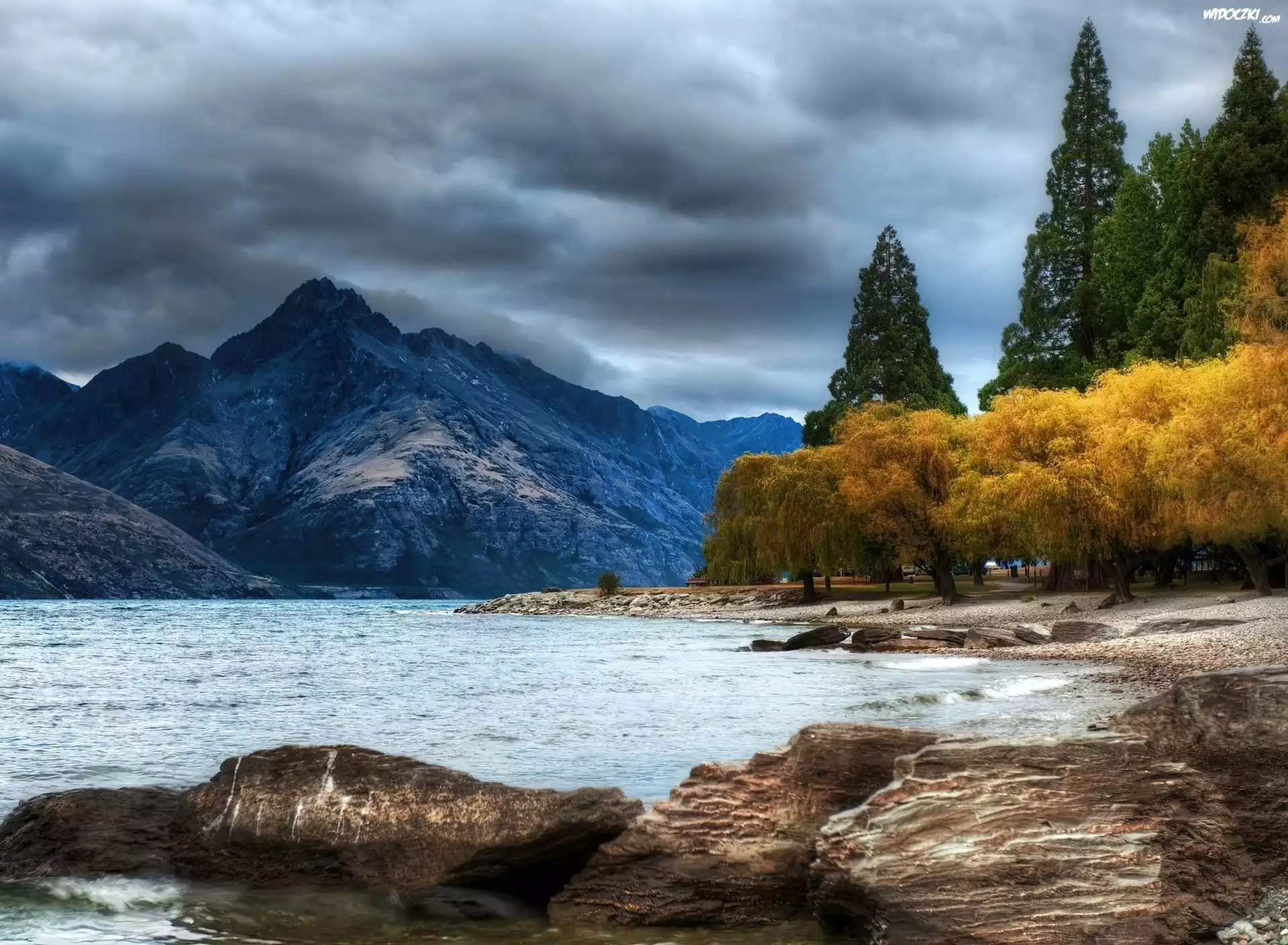 Zdjęcia, Jezioro, Kamienie, Las, Góry, Chmury