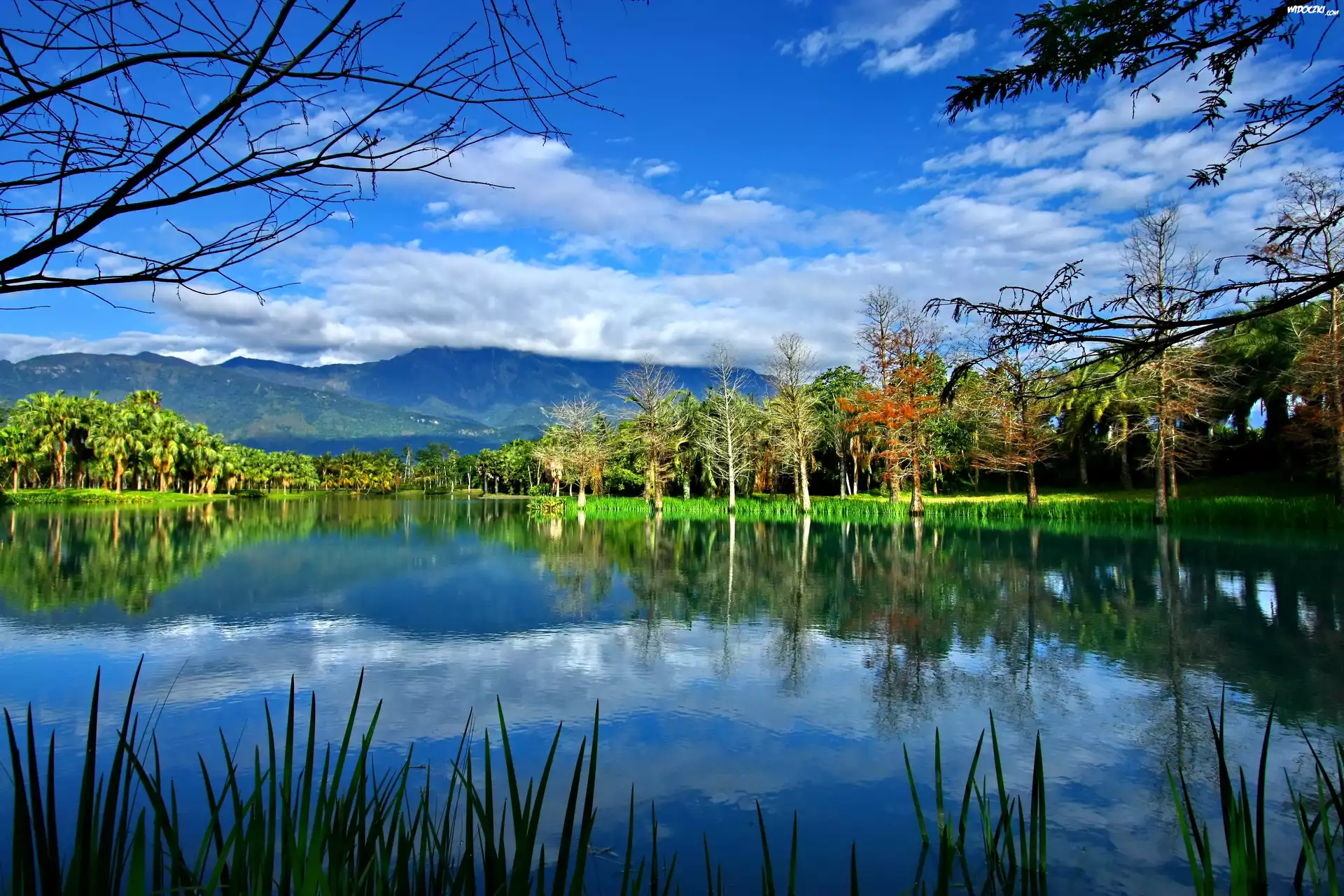 Zdjęcia, Jezioro, Lasy, Góry, Niebo