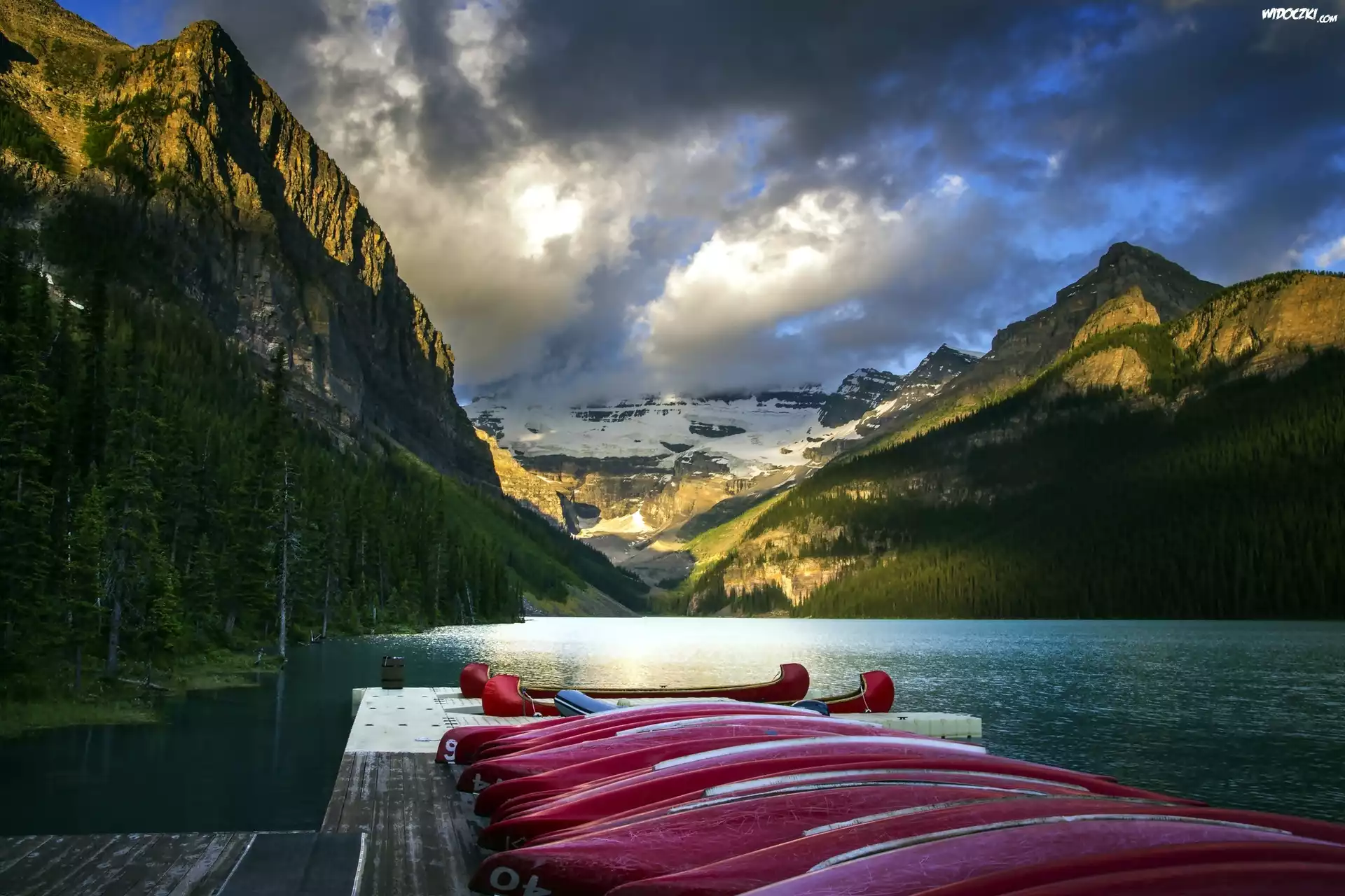 Zdjęcia, Łódki, Góry, Jezioro, Pomost