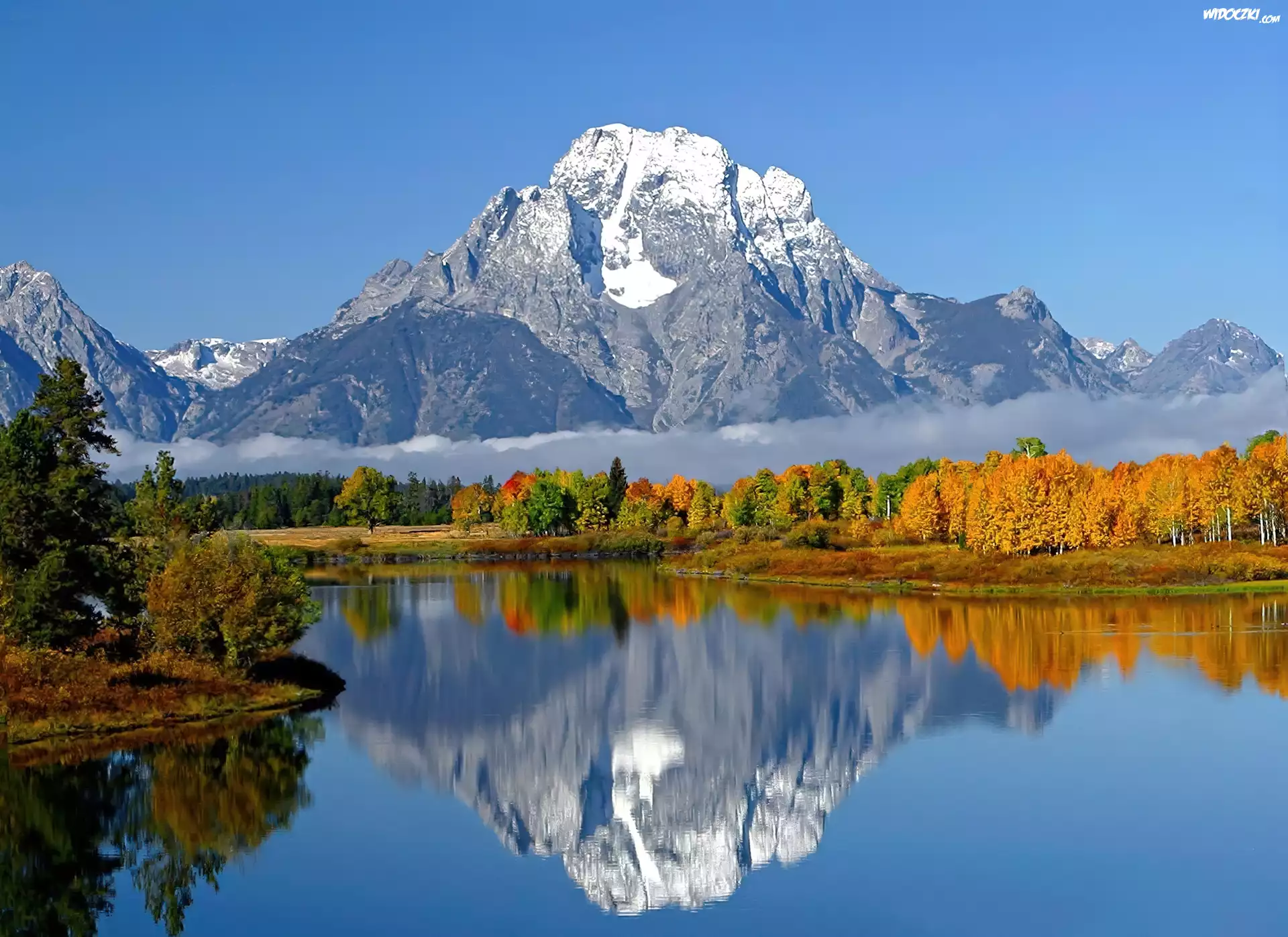 Zdjęcia, Jezioro, Drzewa, Ośnieżone, Góry, Mgła