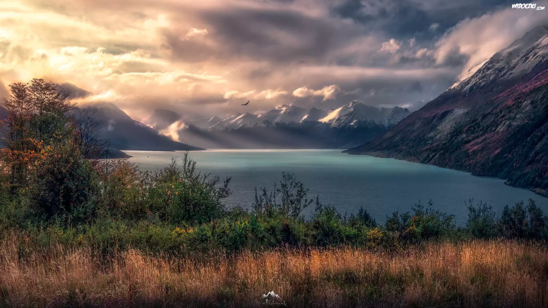 Argentyna, Patagonia, Góry, Jezioro, Jesień, Mgła, Roślinność