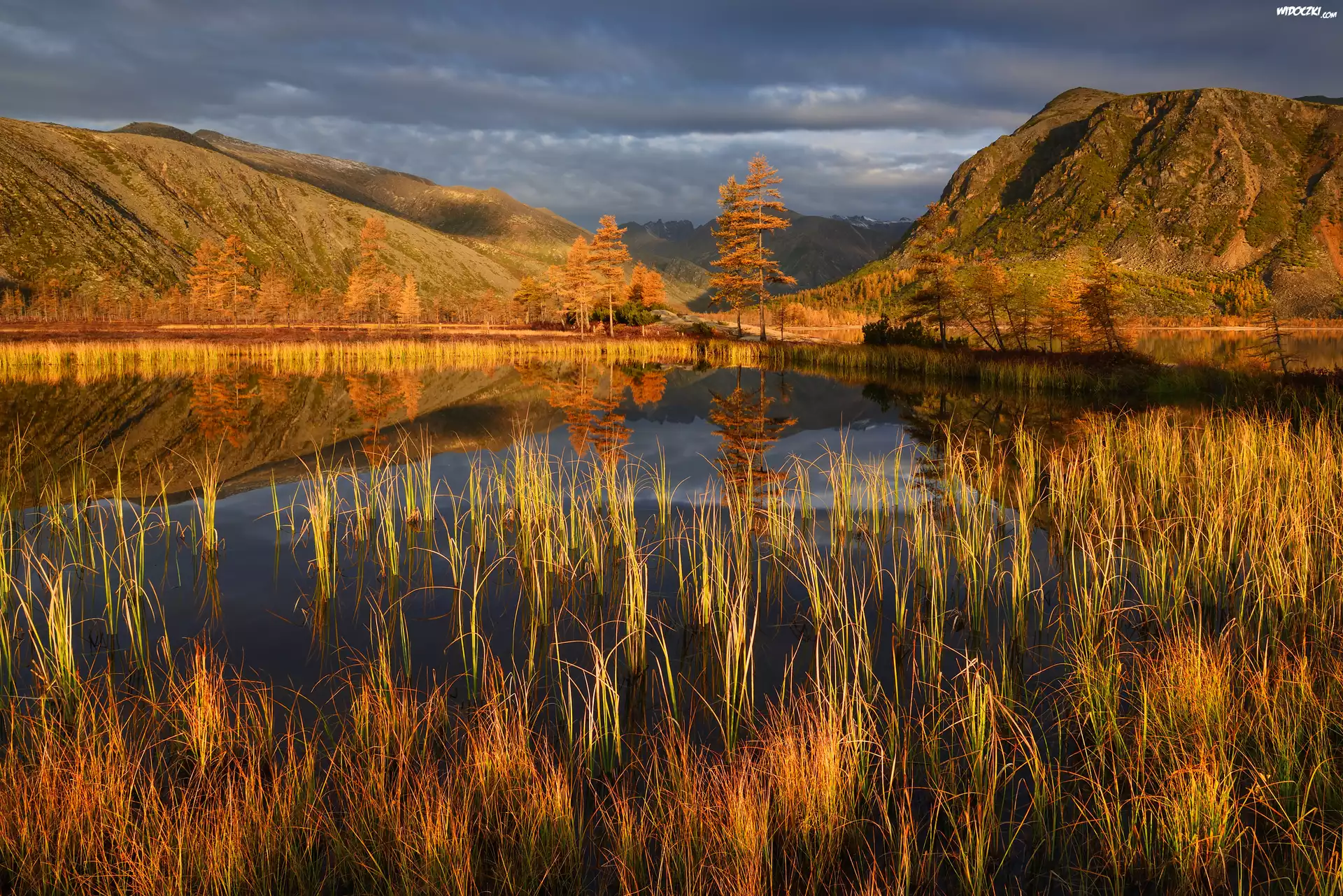 Jezioro, Jack London, Góry, Jesień, Roślinność, Kolorowa, Szuwary, Chmury, Kołyma, Obwód magadański, Rosja |