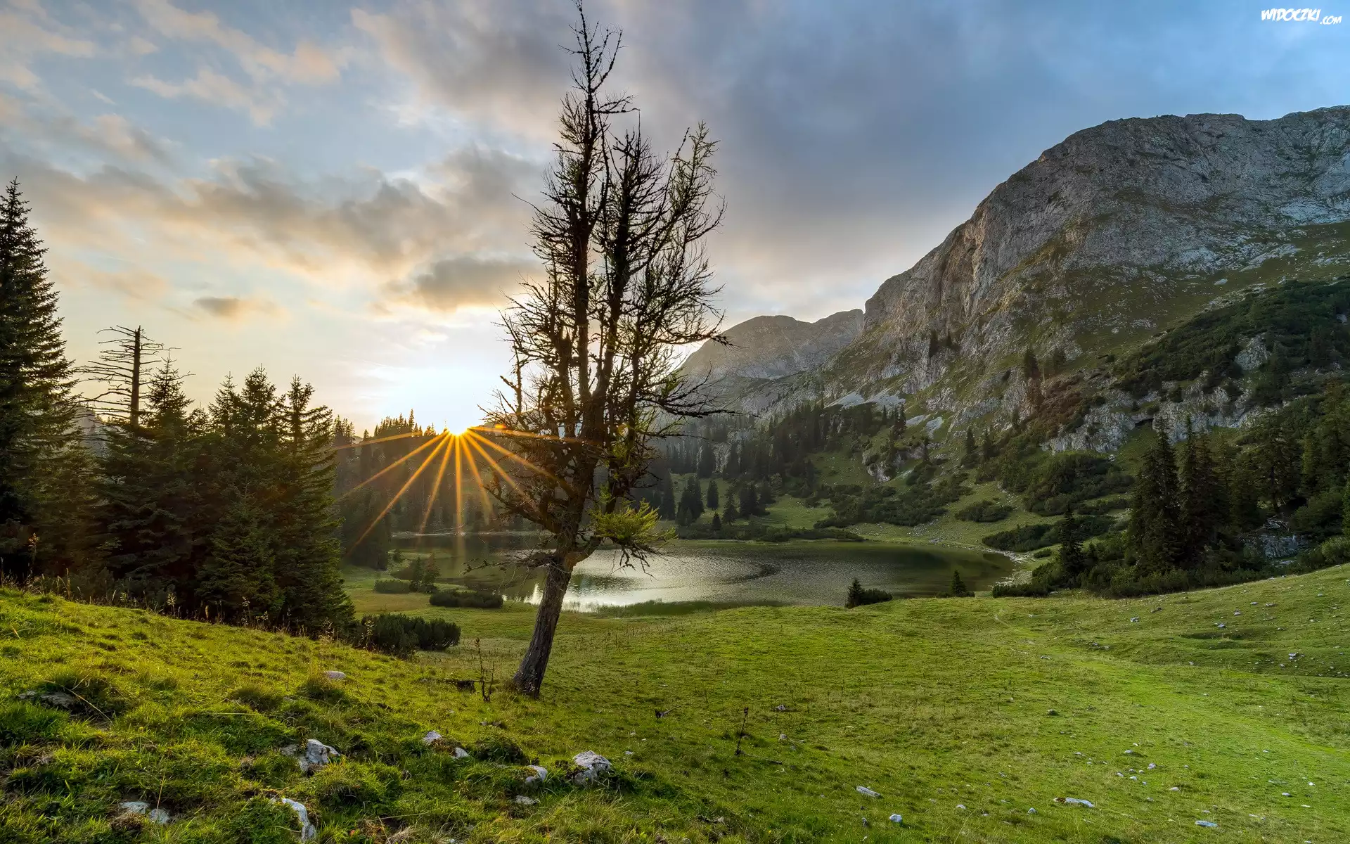 Góry, Jezioro, Drzewo, Promienie słońca, Chmury, Roślinność
