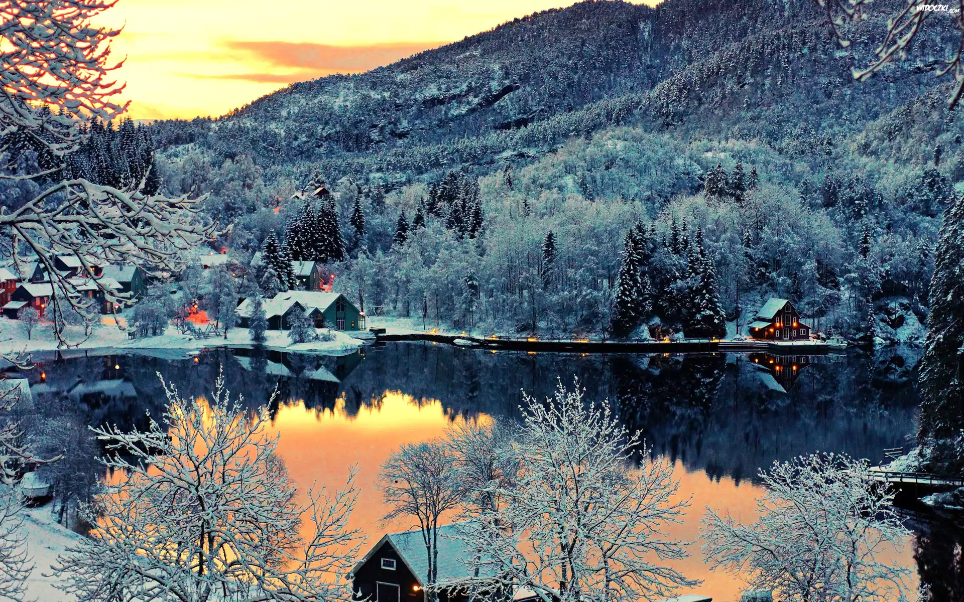 Góry, Jezioro, Zima, Las, Domy, Zachód słońca
