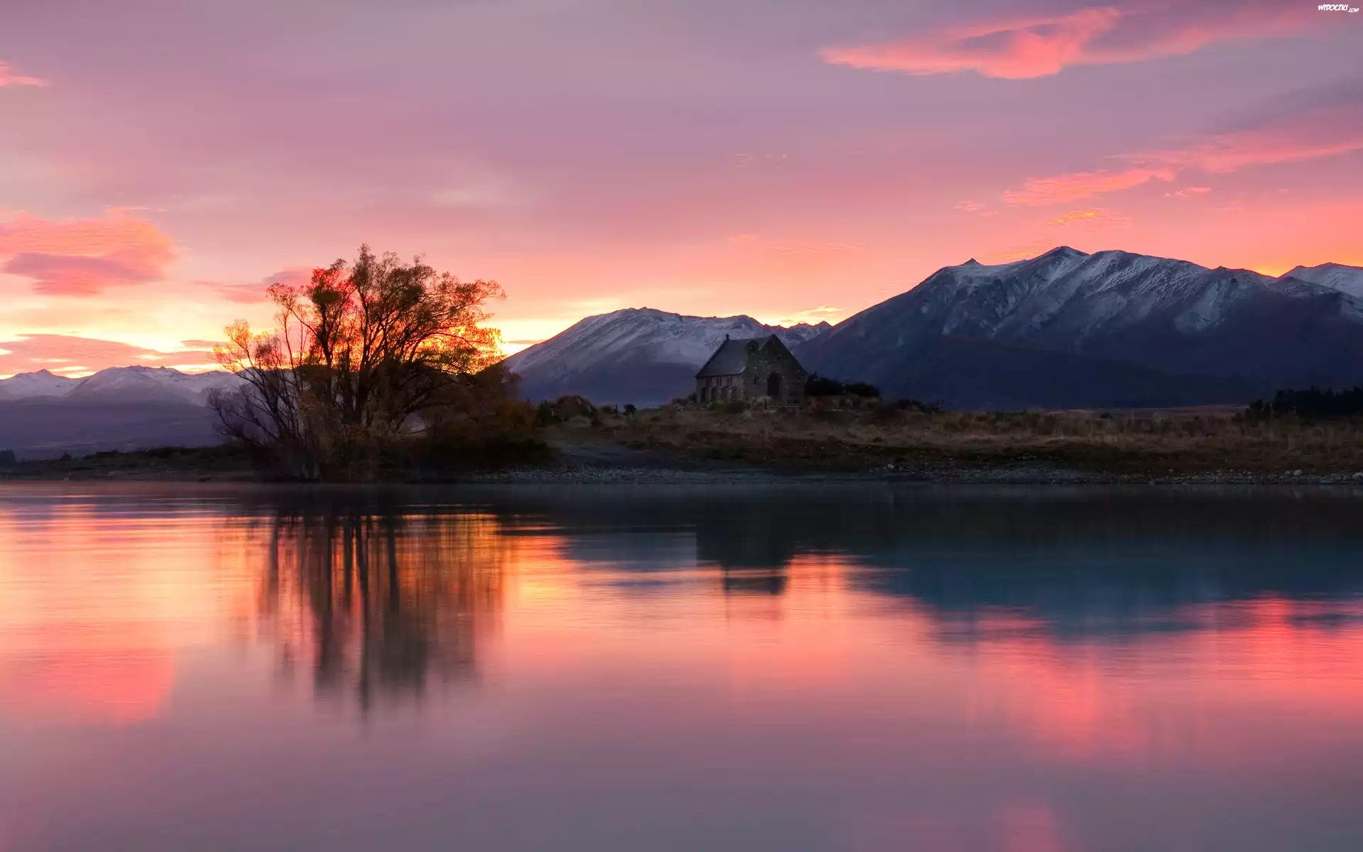 Jezioro, Zachód, Słońca, Drzewo, Góry, Odbicie
