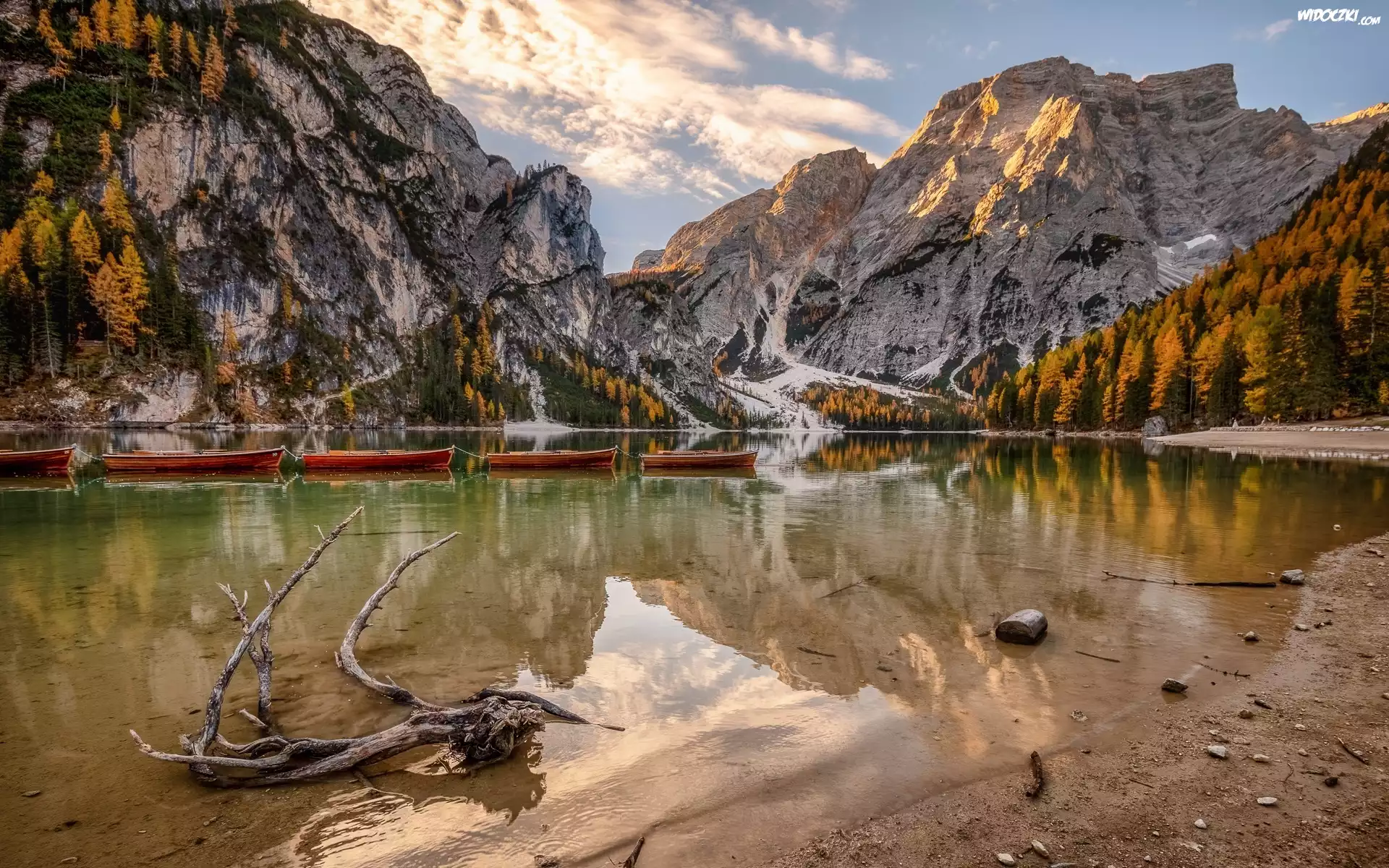 Zdjęcia, Włochy, Południowy Tyrol, Jezioro, Lago di Braies, Pragser Wildsee, Góry, Dolomity, Łódki, Drzewa