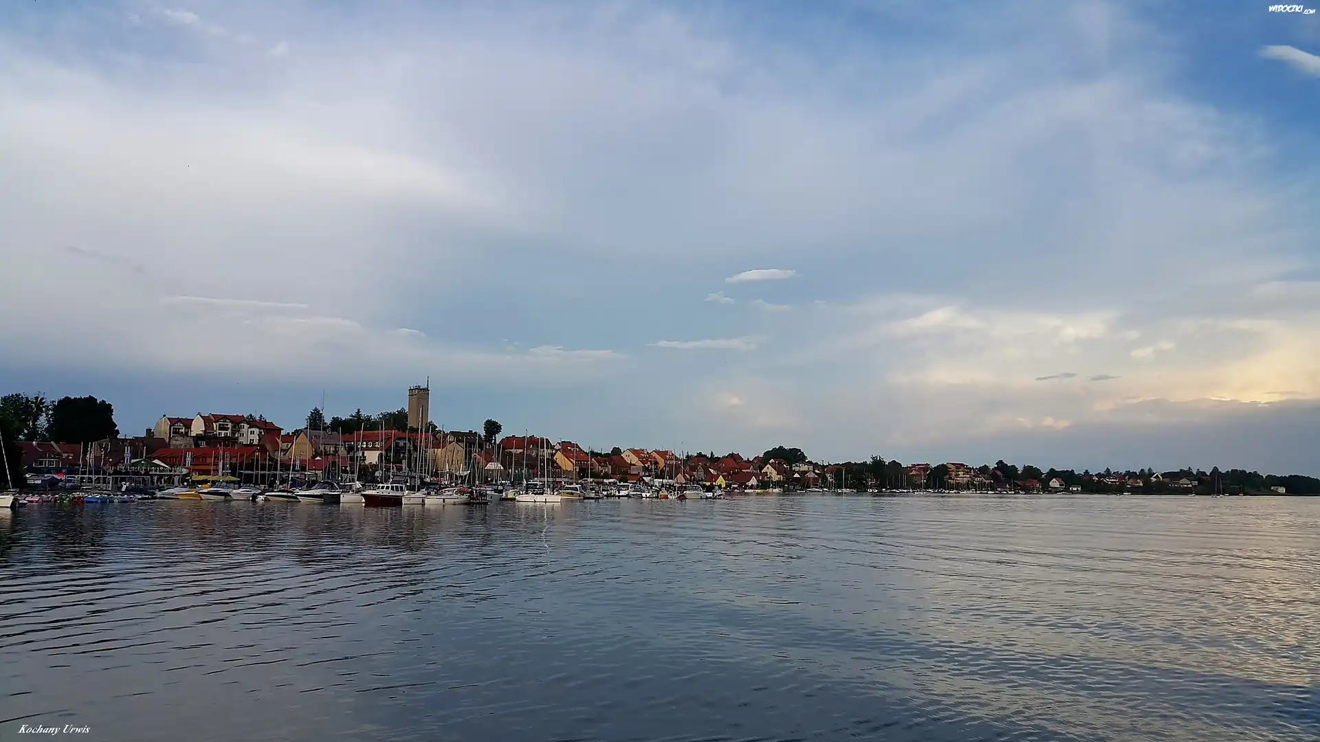 Zdjęcia, Jezioro, Przystań, Motorówki, Jachty, Domy