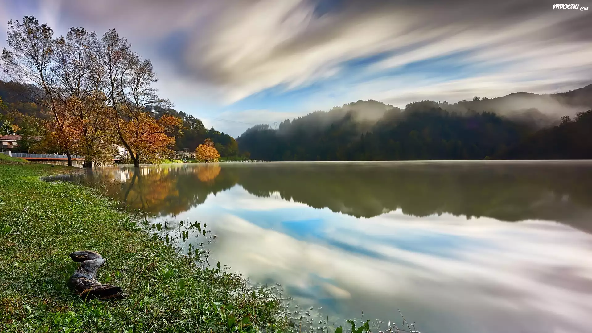 Zdjęcia, Jezioro, Drzewa, Jesień, Chmury