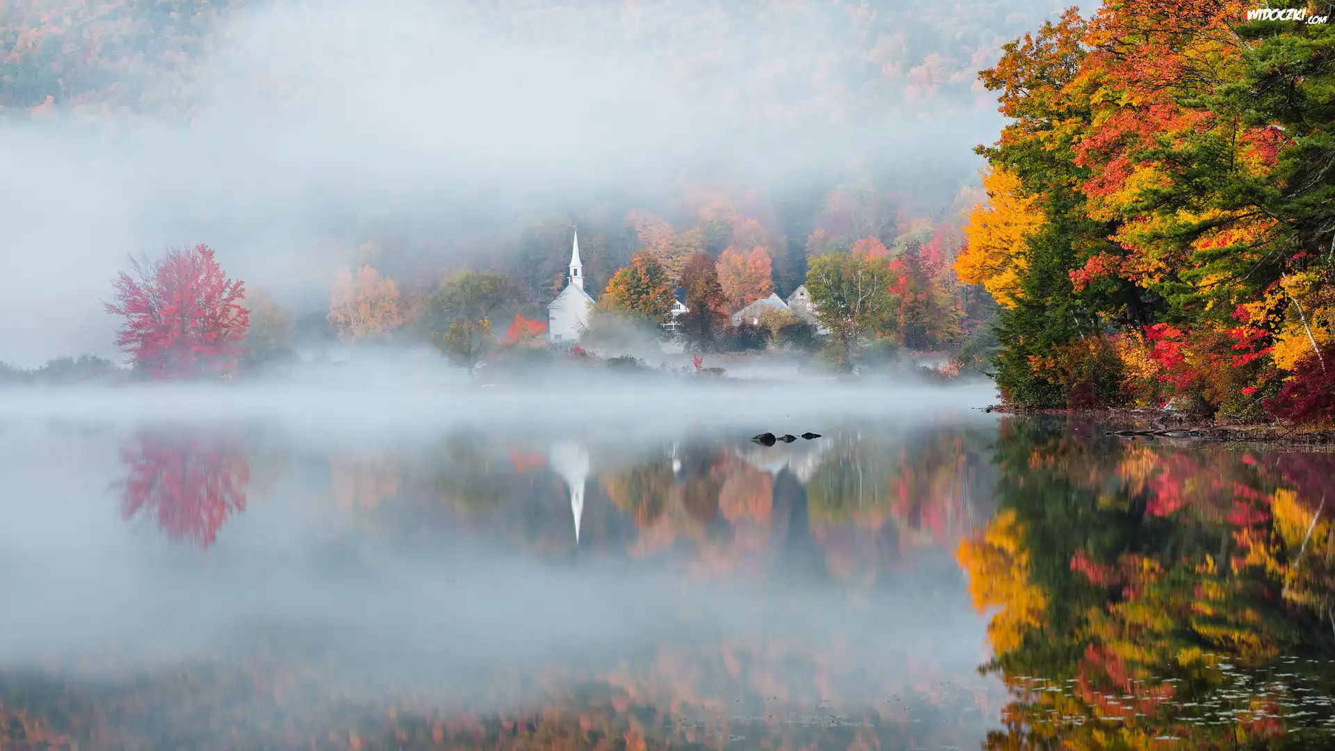 Jesień, Kolorowe, Drzewa, Mgła, Jezioro, Crystal Lake, Kościół, Eaton, Stan New Hampshire, Stany Zjednoczone |