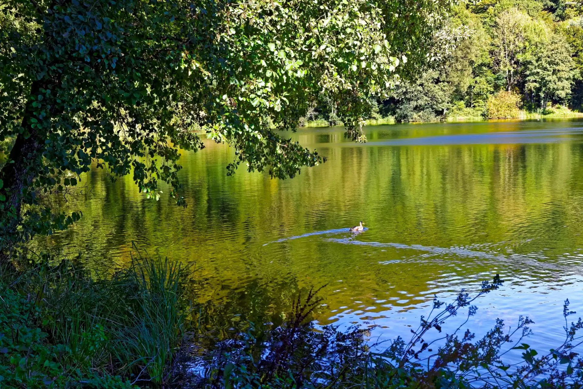 Jezioro, Gillenfeld, Drzewa, Krzewy, Kaczka, Niemcy