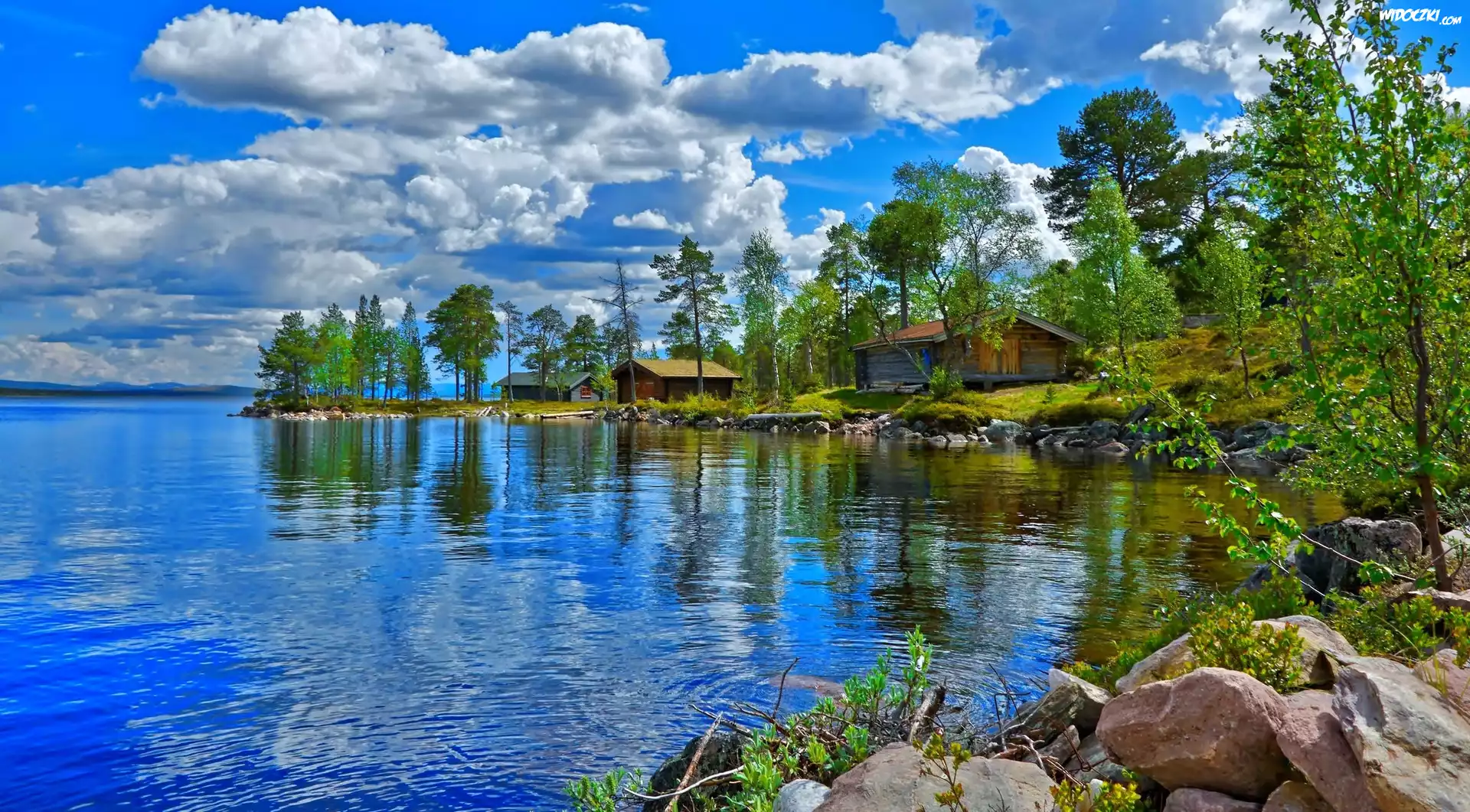 Jezioro, Letnie, Domki, Drzewa, Kamienie, Chmury