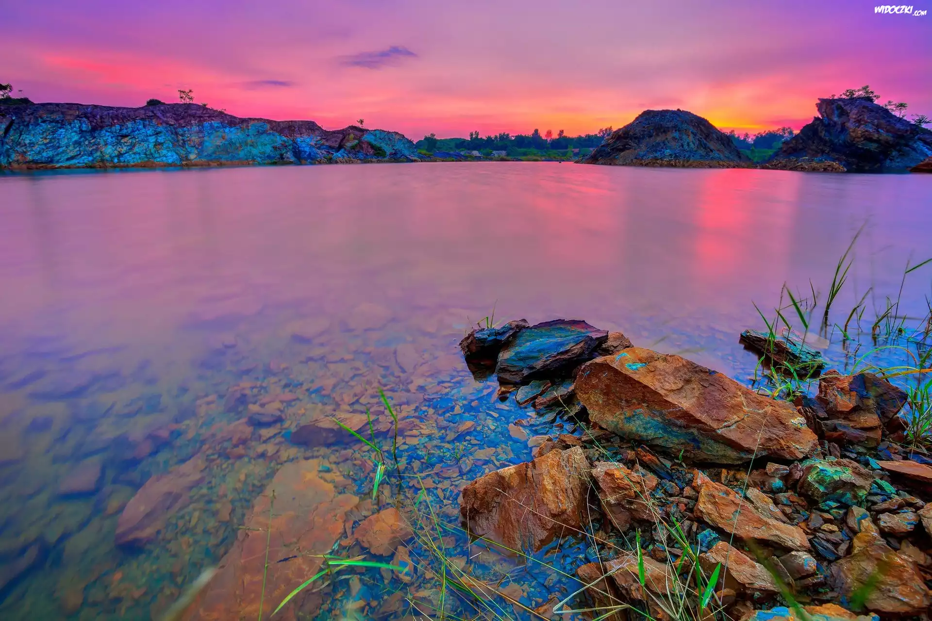 Zdjęcia, Jezioro, Zachód słońca, Kamienie, Wzgórza