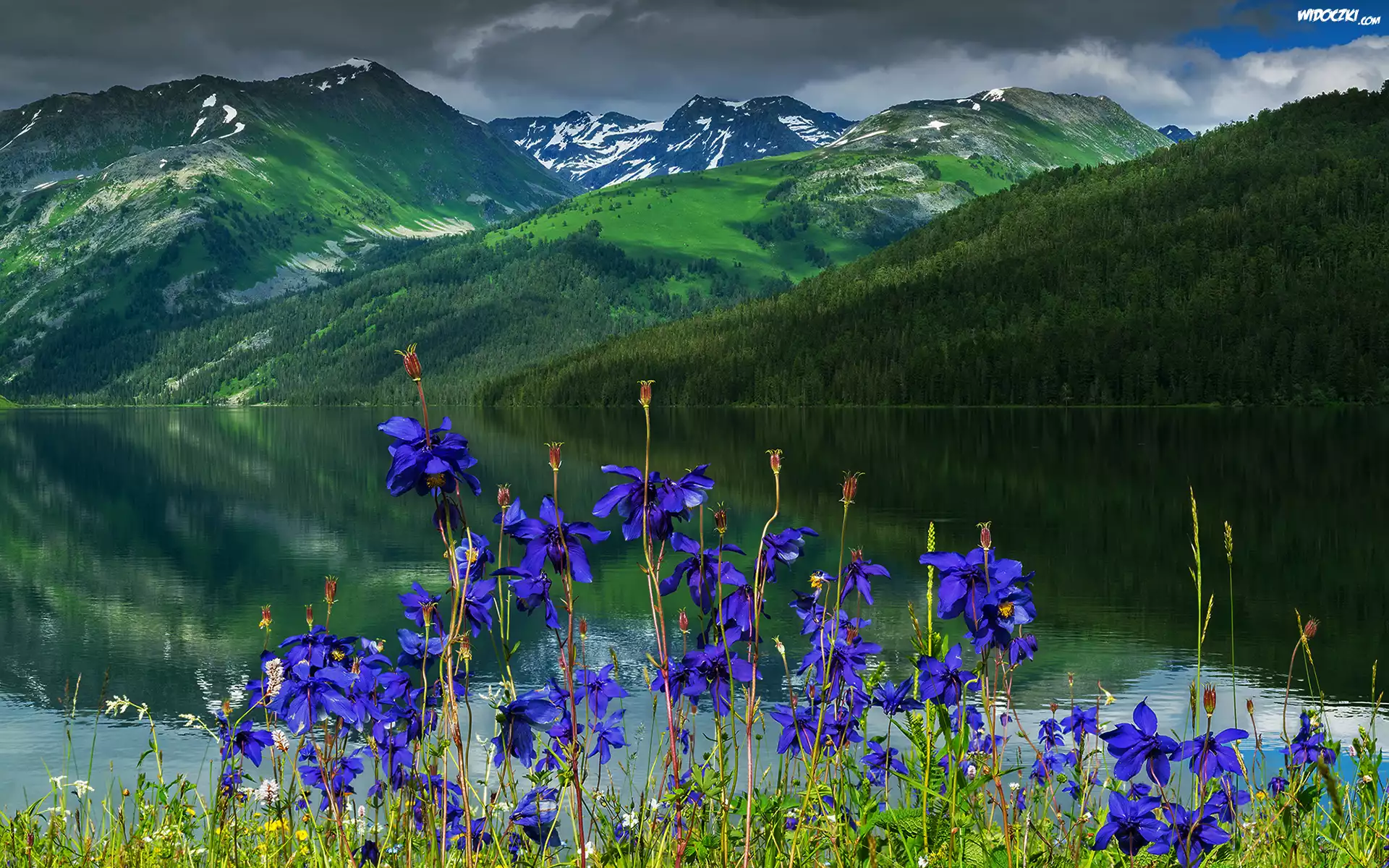 Zdjęcia, Góry Ałtaj, Jezioro Teleckie, Katuński Państwowy Rezerwat Biosfery, Rosja, Odbicie, Kwiaty
