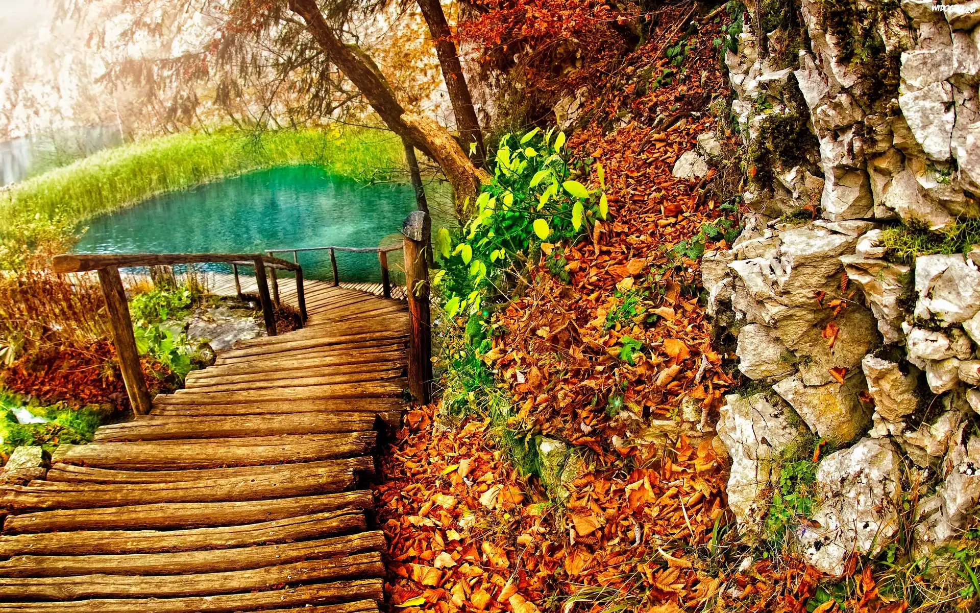 Zdjęcia, Jezioro, Drewniana, Kładka, Liście