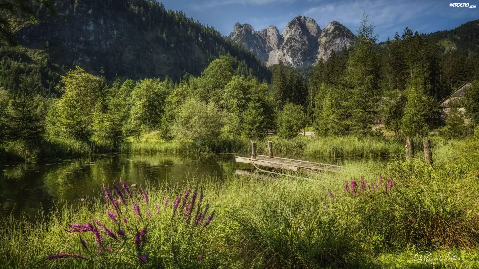 Zdjęcia, Góry, Jezioro, Kładka, Drzewa, Szuwary
