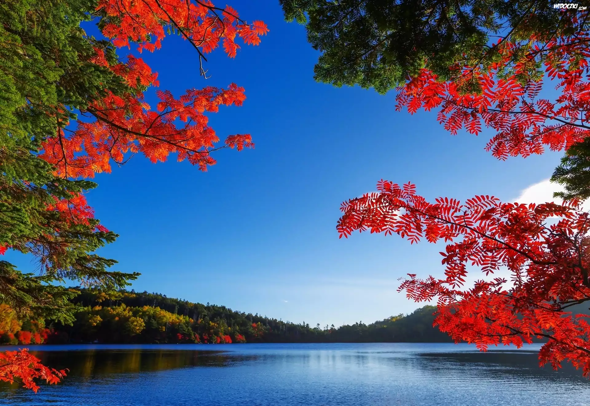 Zdjęcia, Jezioro, Drzewa, Gałęzie, Kolorowe, Liście