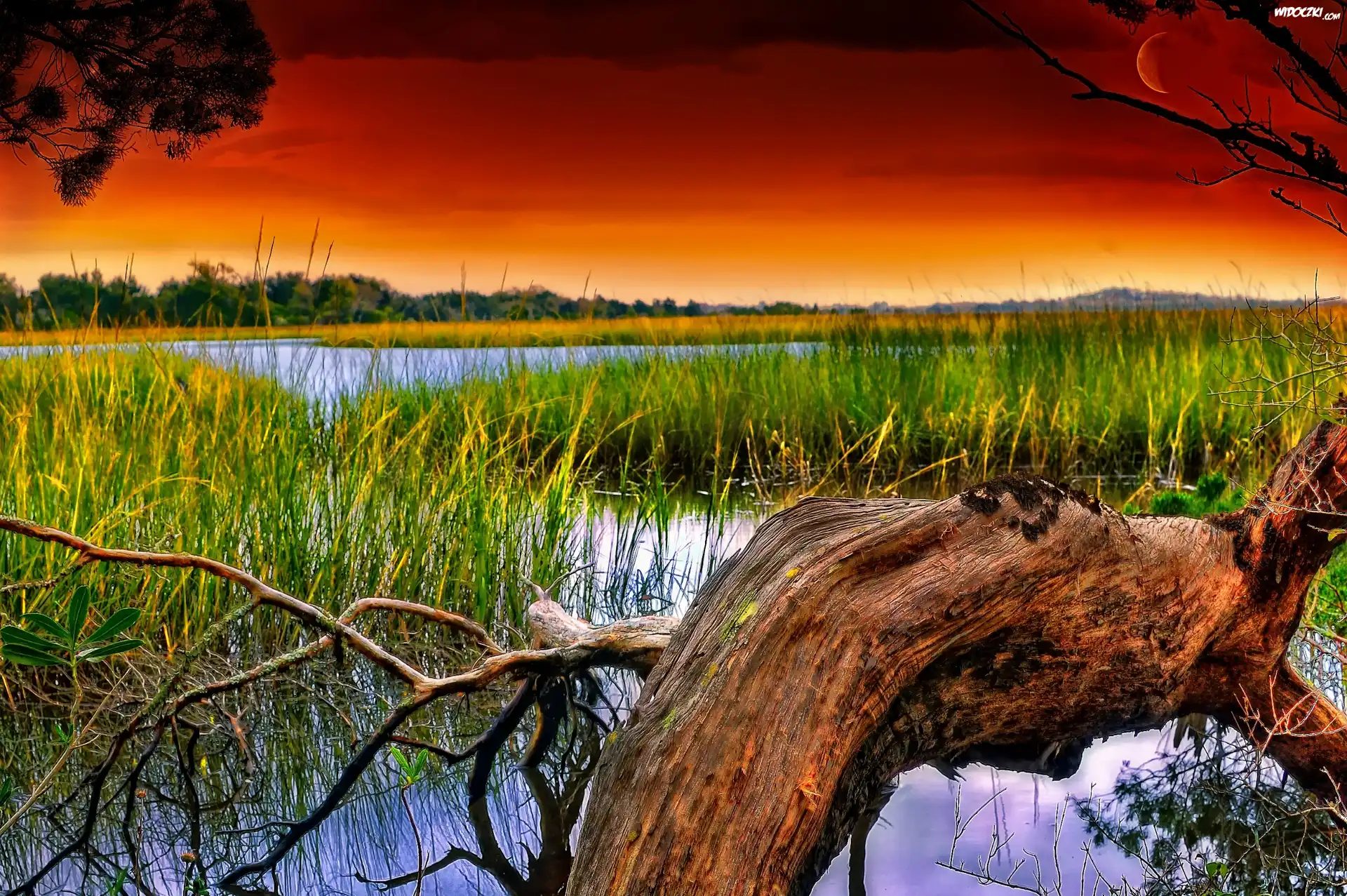 Zdjęcia, Jezioro, Zachód, Słońca, Konar, Drzewa