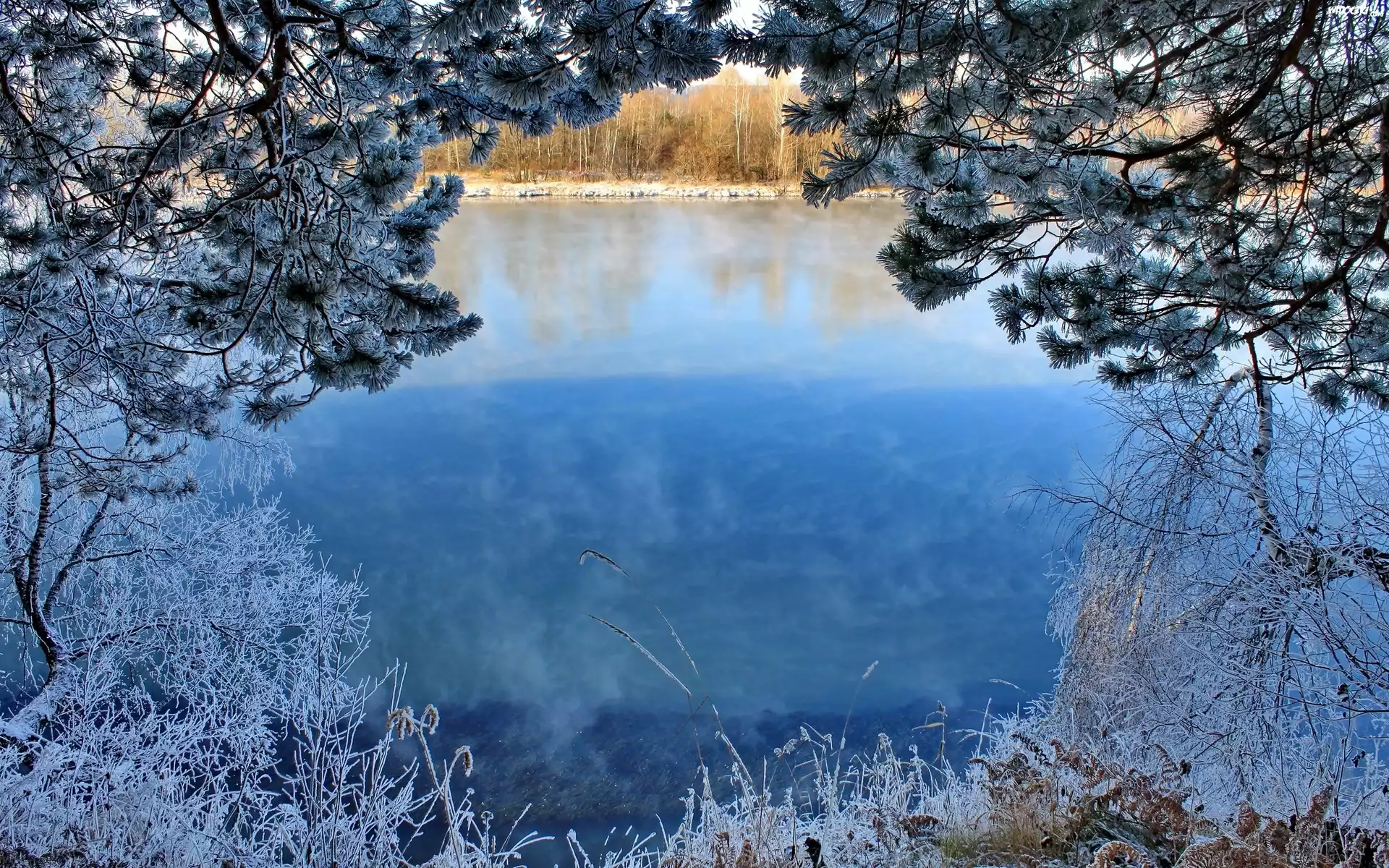 Jezioro, Zmrożone, Drzewa, Krzewy, Zima