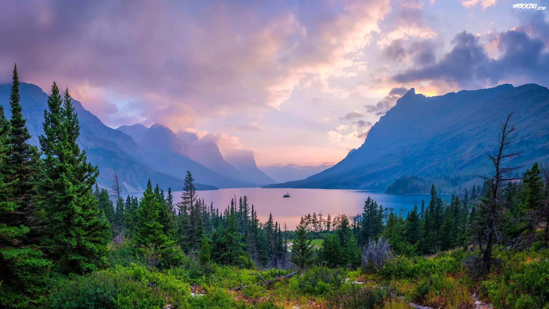 Zdjęcia, Park Narodowy Glacier, Jezioro, Saint Mary Lake, Góry, Drzewa, Krzewy, Niebo, Stany Zjednoczone