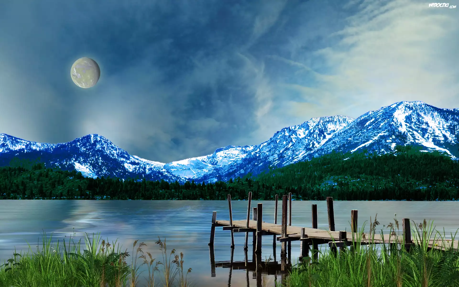 Zdjęcia, Jezioro, Góry, Księżyc, Pomost