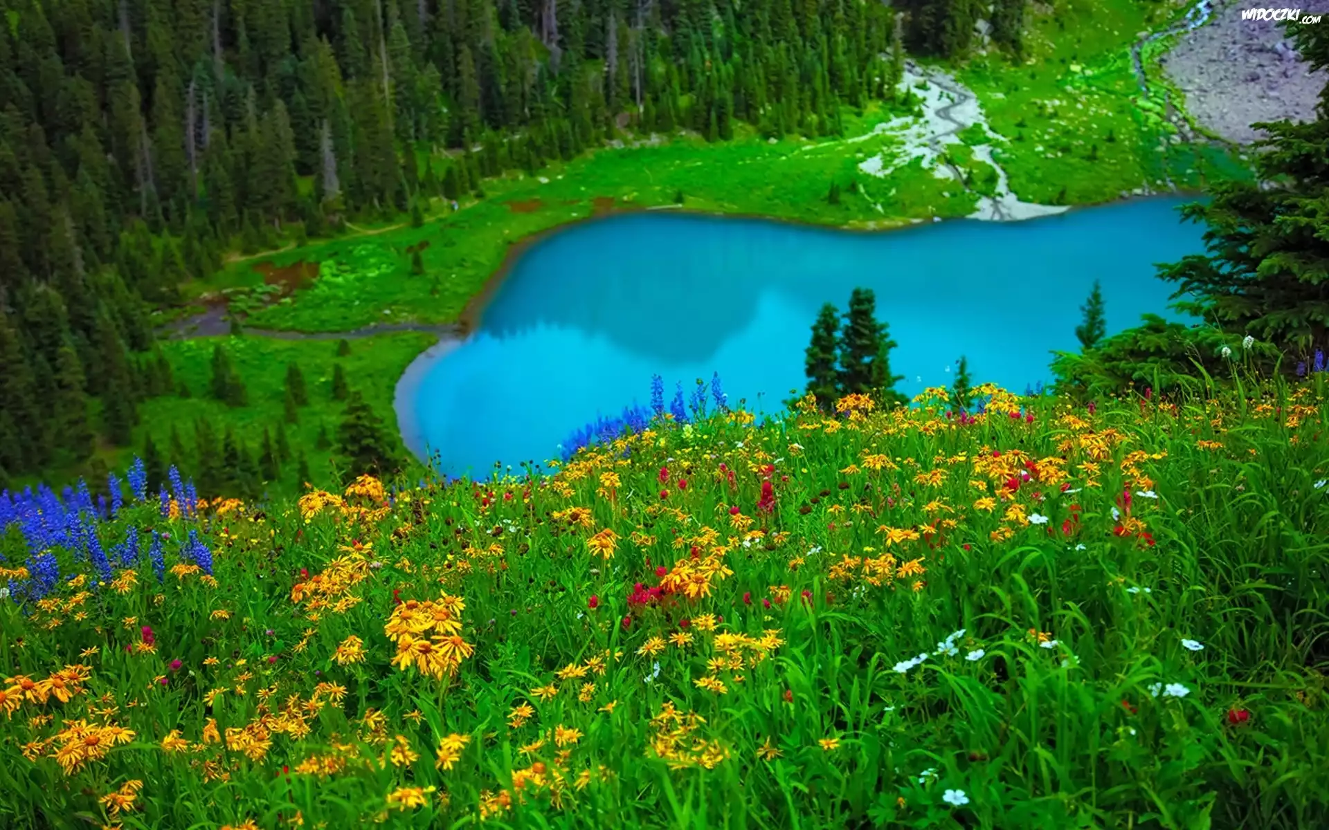 Zdjęcia, Jezioro, Turkusowe, Las, Łąka, Kwiaty, Wiosna