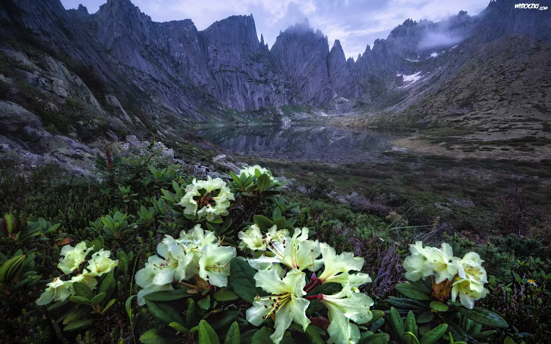 Zdjęcia, Góry, Skały, Kwiaty, Żółte, Azalie, Rododendron, Chmury, Jezioro