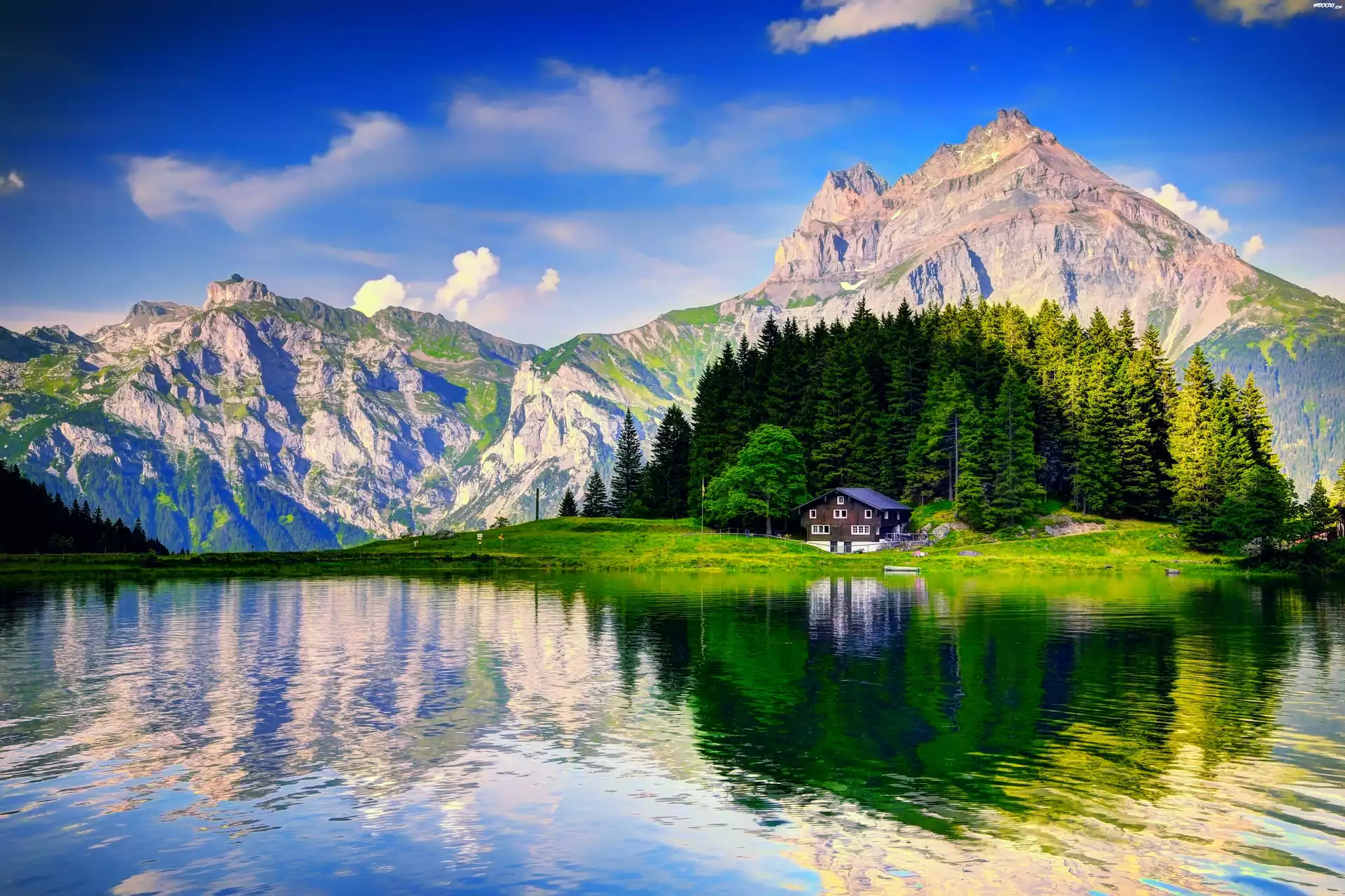 Jezioro, Góry, Dom, Las, Odbicie