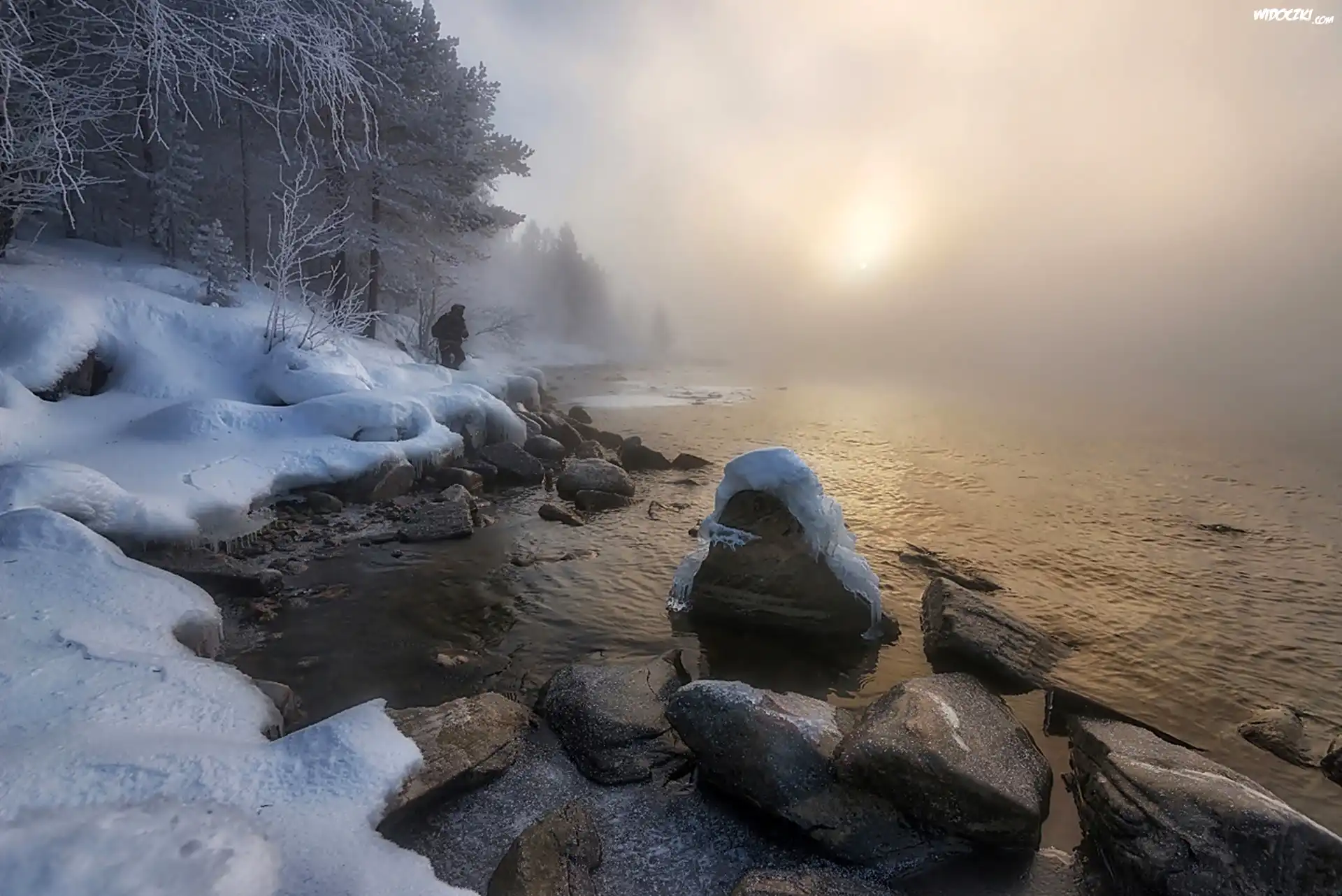 Zdjęcia, Jezioro, Mgła, Kamienie, Las, Postać