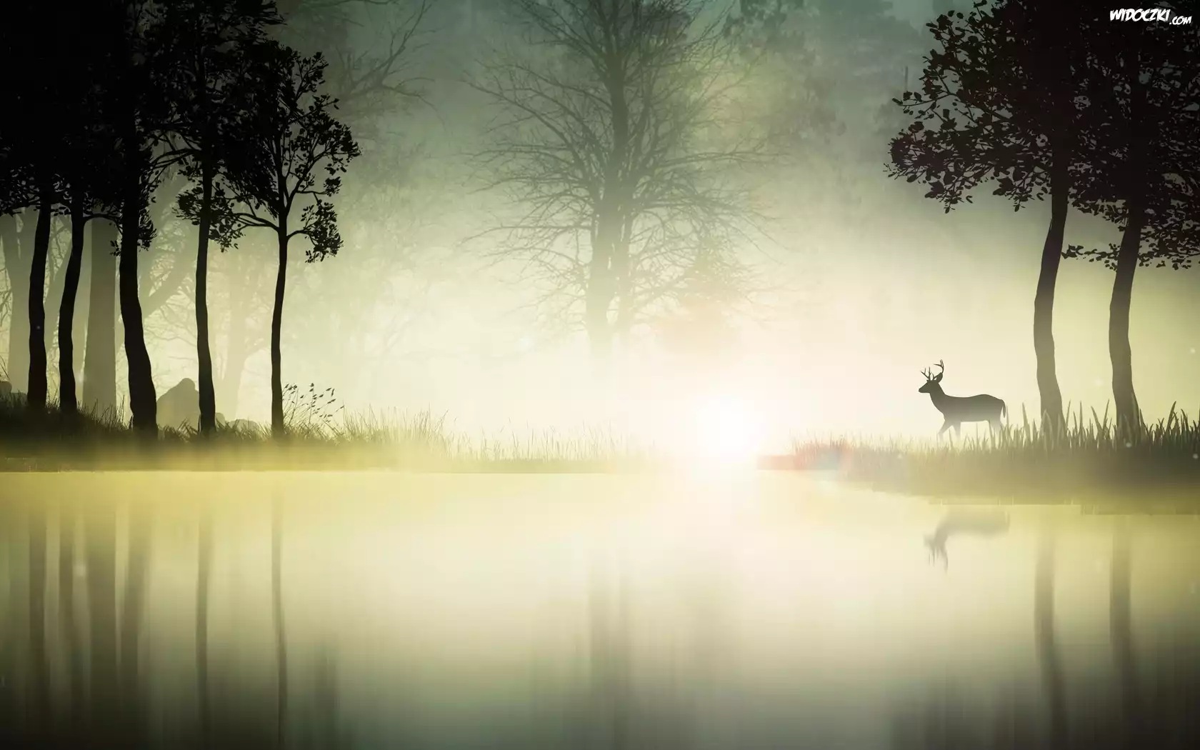 Jezioro, Mgła, Las, Jeleń