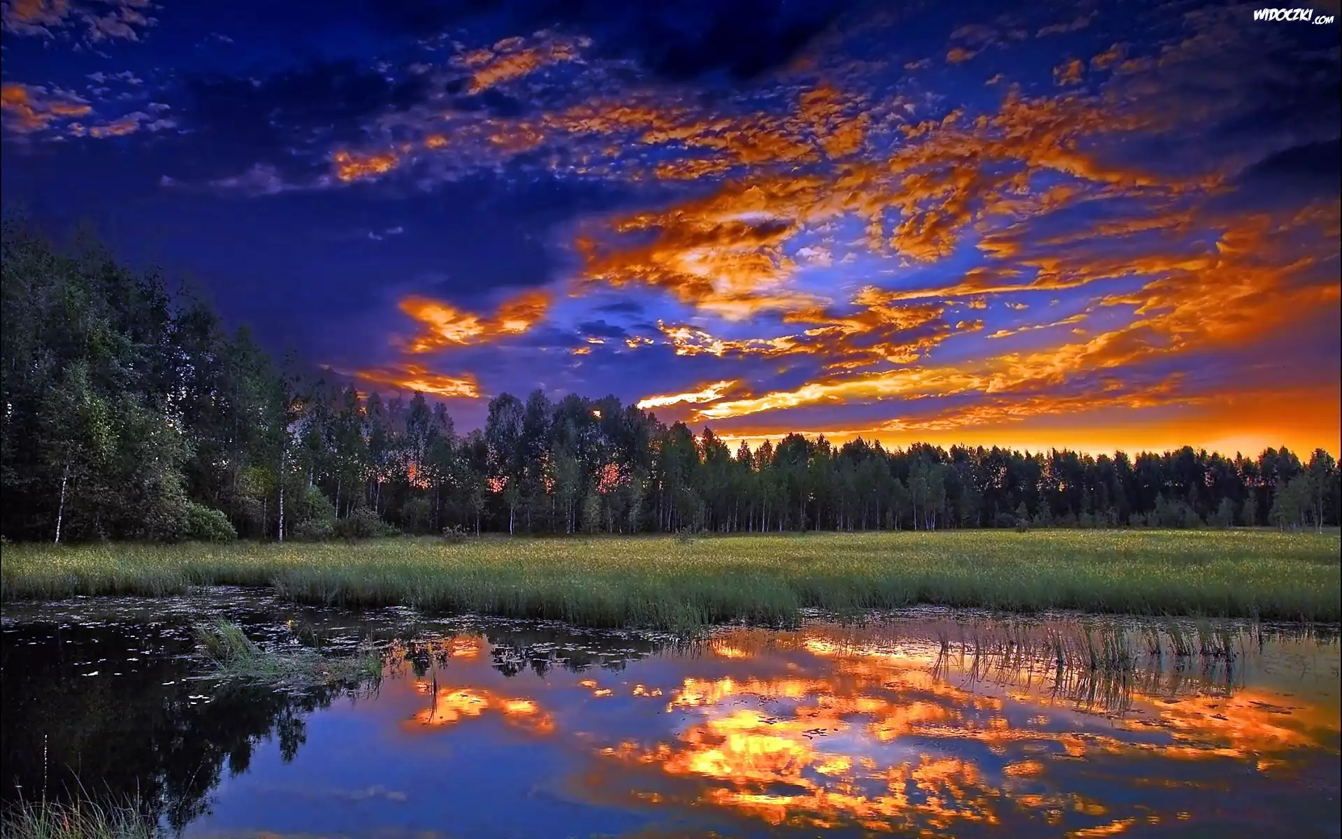 Las, Jezioro, Szuwary, Chmury, Przebijające, Światło, Odbicie