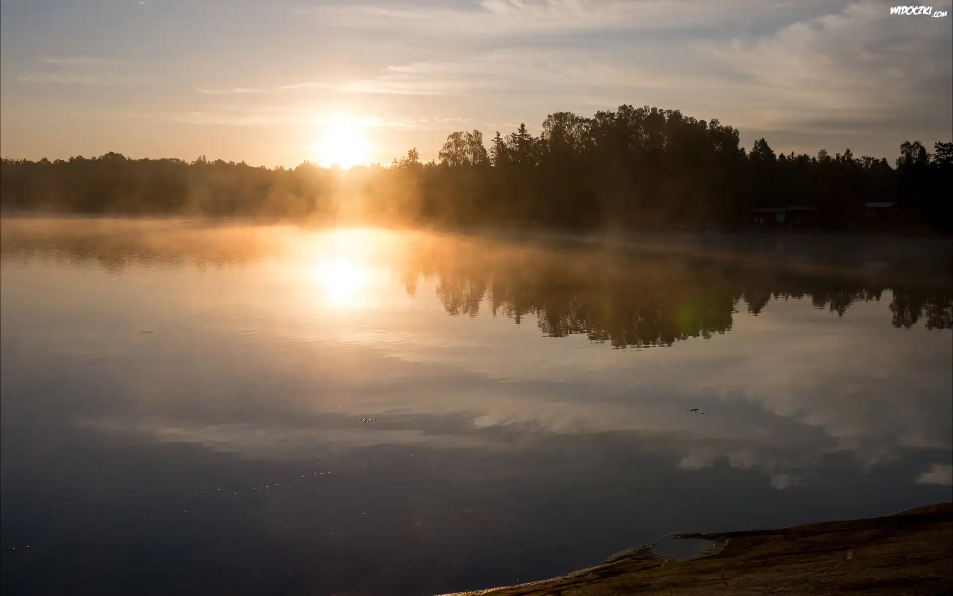 Jezioro, Wschód słońca, Mgła, Las, Odbicie