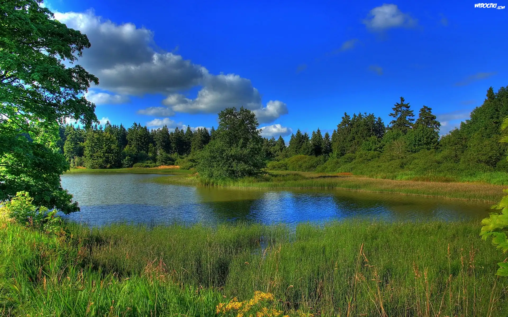 Zdjęcia, Jezioro, Szuwary, Las, Lato