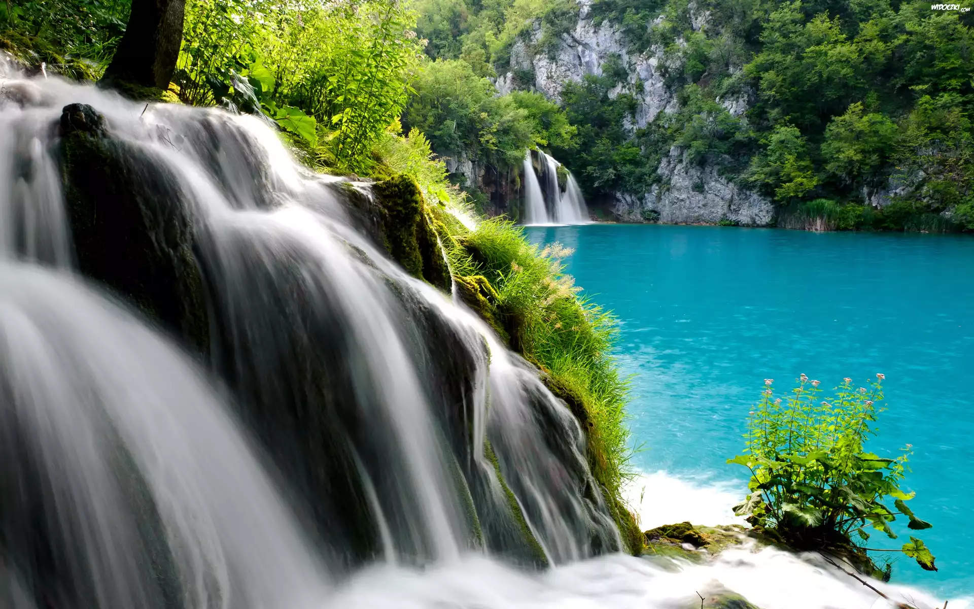 G贸ra, Jeziora Krajobraz, Wodospad, Woda Jezioro, Yumiike, Japonia Wodospad Jesie艅, Las Zach贸d, S艂o艅ca, Chmury, Jezioro Wodospad, Rzeka, Kamienie G贸ry, Woda, Choinki Rzeka, Las Wodospad, Chmury Wodospad, drzewa Las, Promienie, S艂o艅ca Las, Przenikaj膮ce swiat艂o G贸ra, Jeziora
