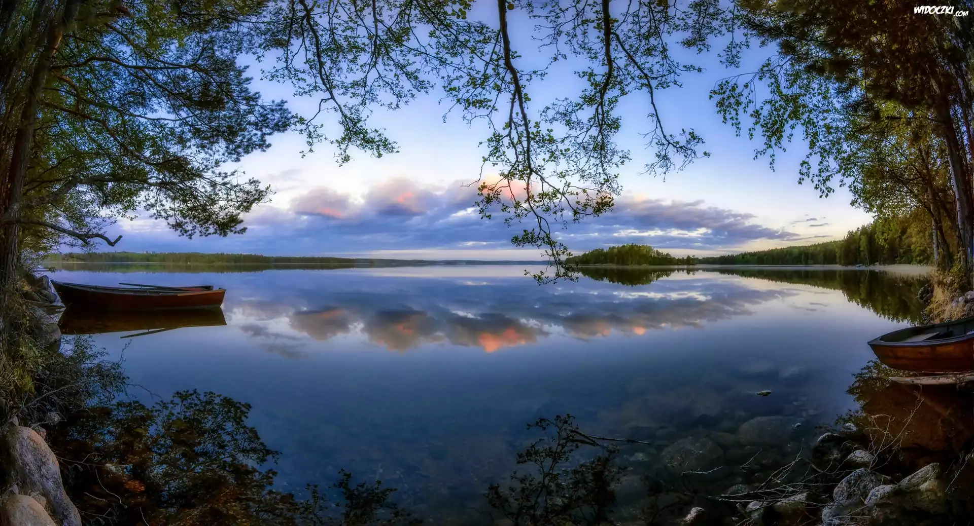 Jezioro, Łódki, Drzewa, Lasy, Świt
