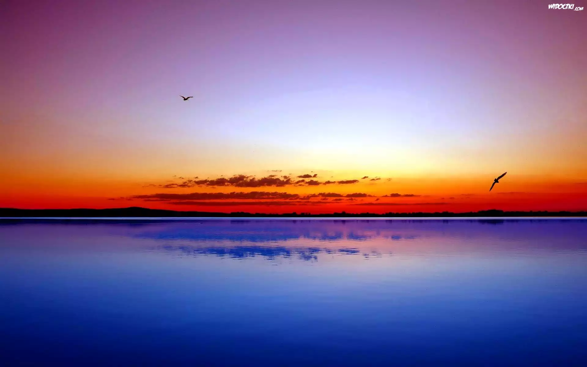 Jezioro, Zachód Słońca, Lato, Ptaki
