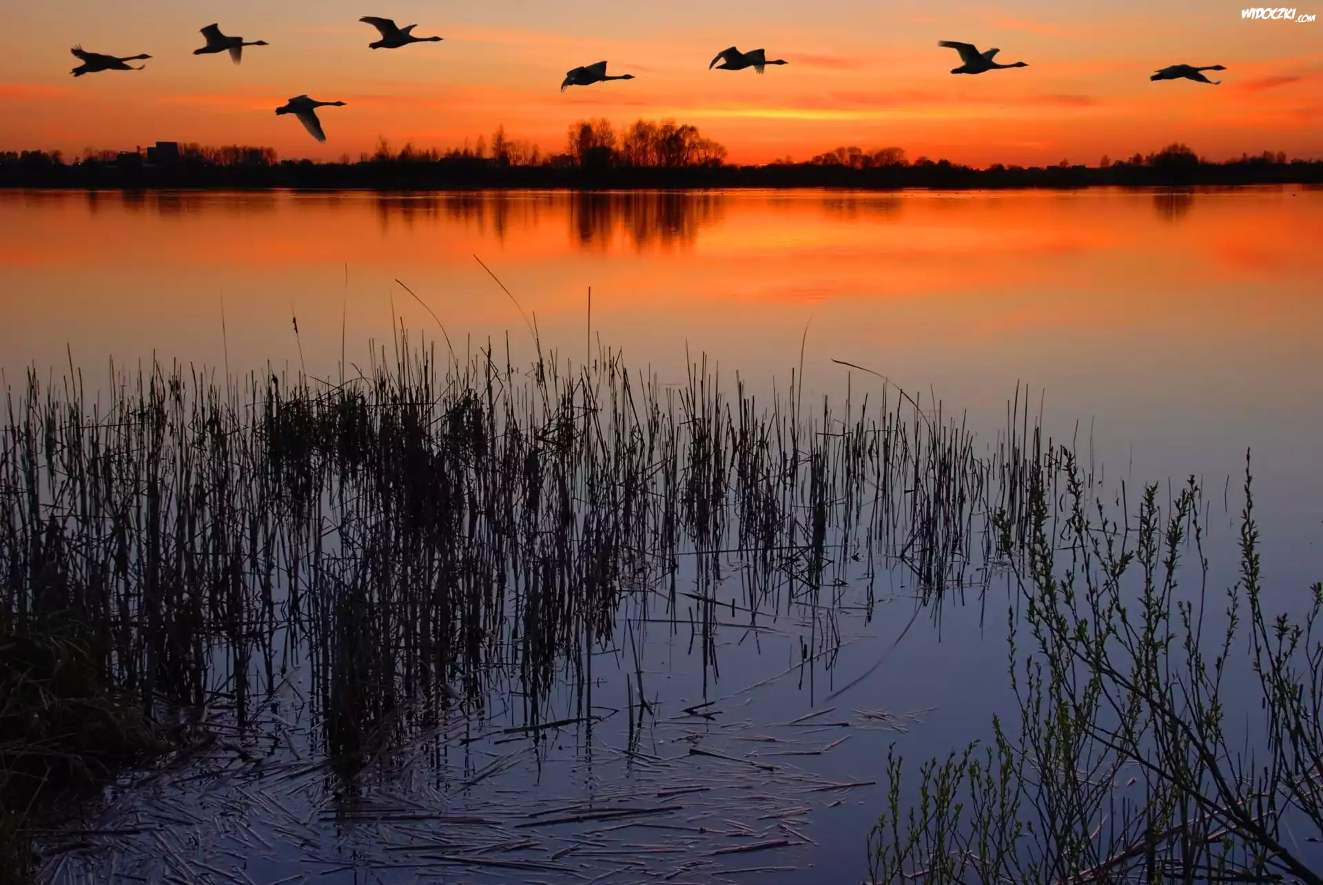 Jezioro, Zachód, Słońca, Lecące, Ptaki