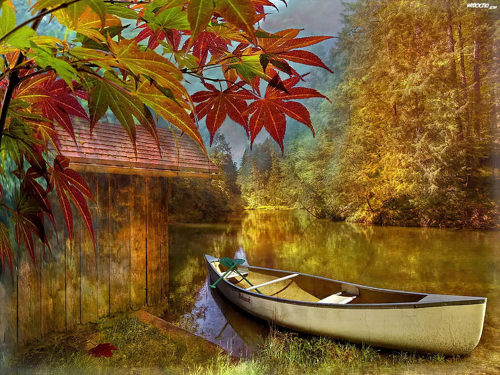 Zdjęcia, Jezioro, Łódka, Liście, Malarstwo