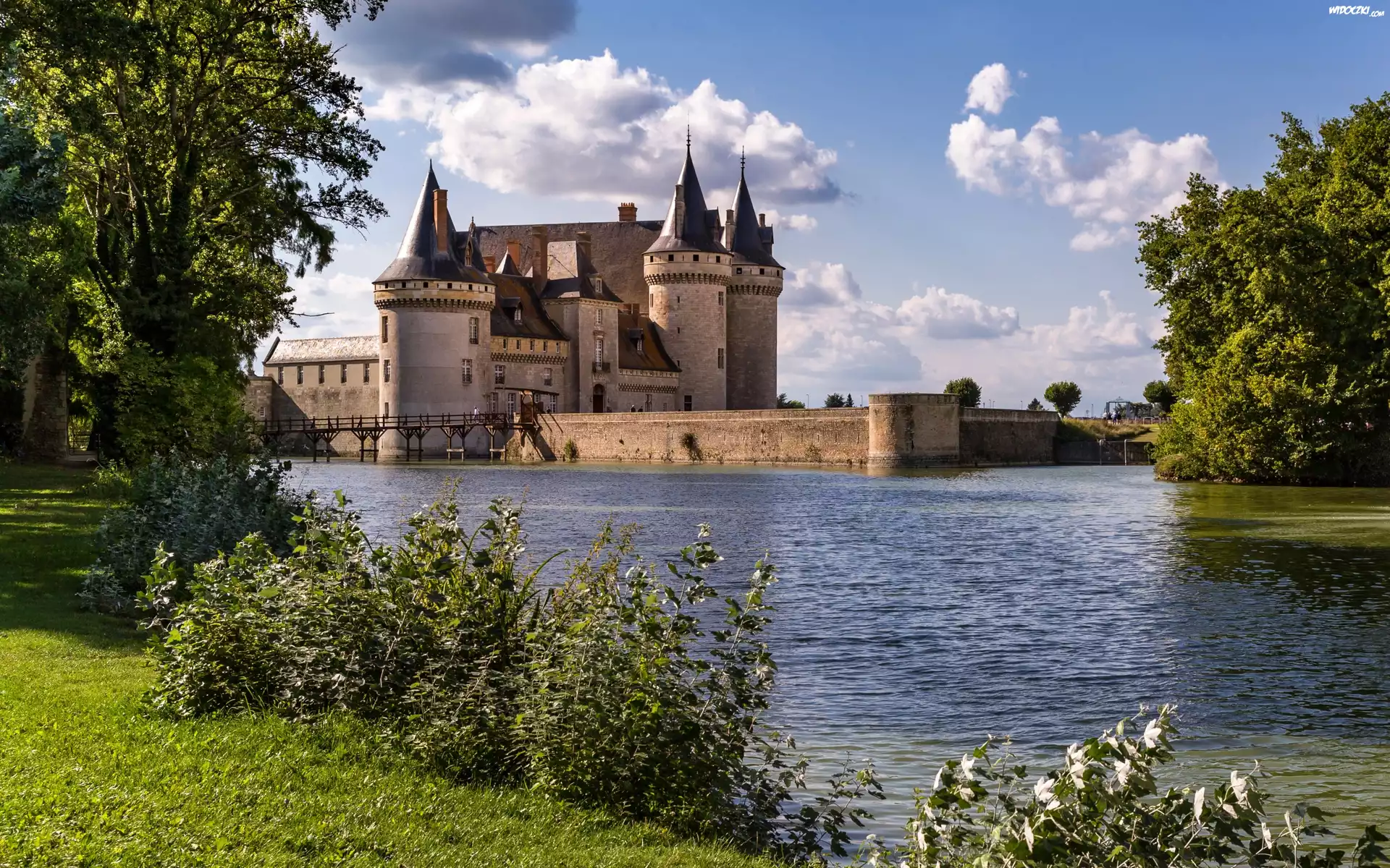 Zdj臋cia, Francja, Burgundia, Sully Sur Loire, Zamek, Most, Jezioro, Park Jezioro