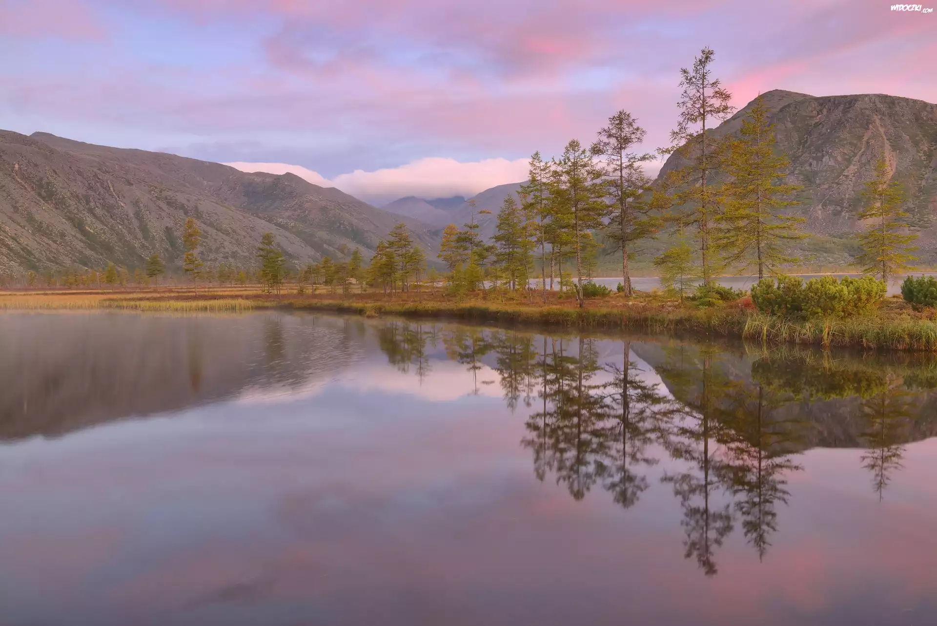 Zdjęcia, Góry Kołymskie, Jezioro Jack London, Drzewa, Odbicie, Kołyma, Obwód magadański, Rosja