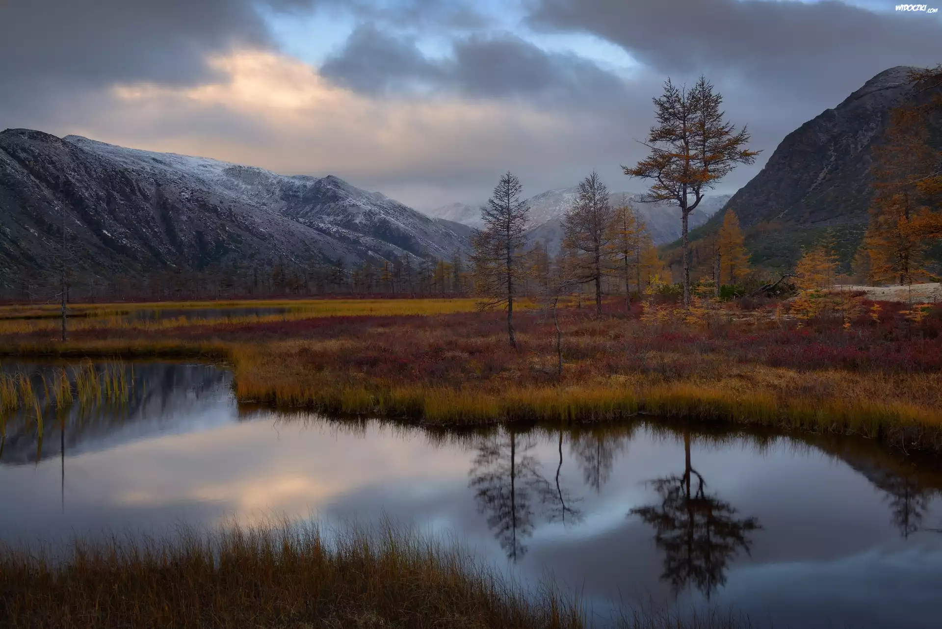Zdjęcia, Góry Kołymskie, Jezioro Jack London, Drzewa, Jesień, Kołyma, Obwód magadański, Rosja