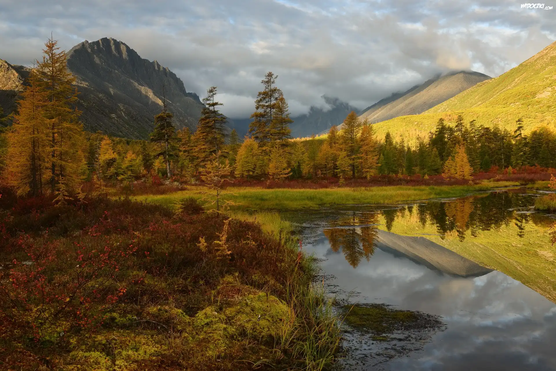Zdjęcia, Góry, Drzewa, Jezioro Jack London, Odbicie, Jesień, Kołyma, Obwód magadański, Rosja