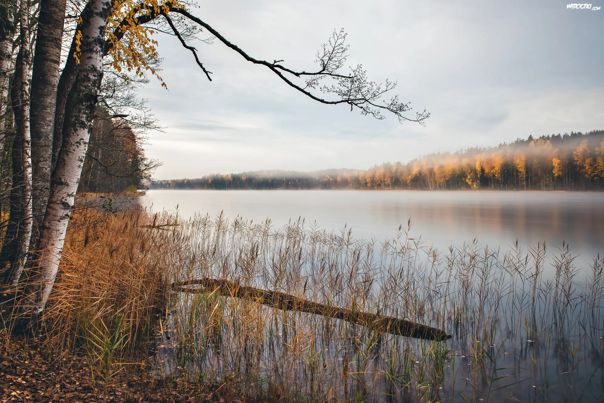 Jezioro, Drzewa, Brzozy, Poranek, Mgła, Jesień