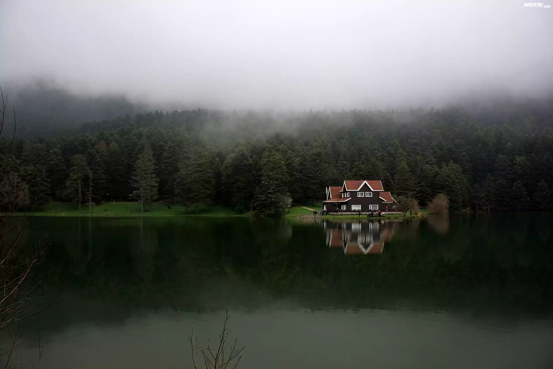 Zdjęcia, Jezioro, Las, Dom, Mgła, Odbicie