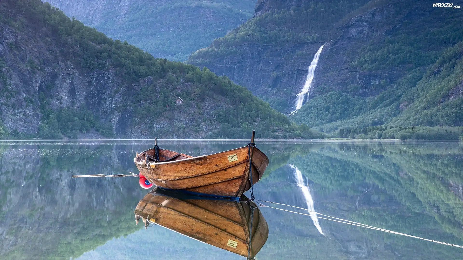 Zdjęcia, Skały, Wodospad, Drzewa, Jezioro, Łódka, Mgła