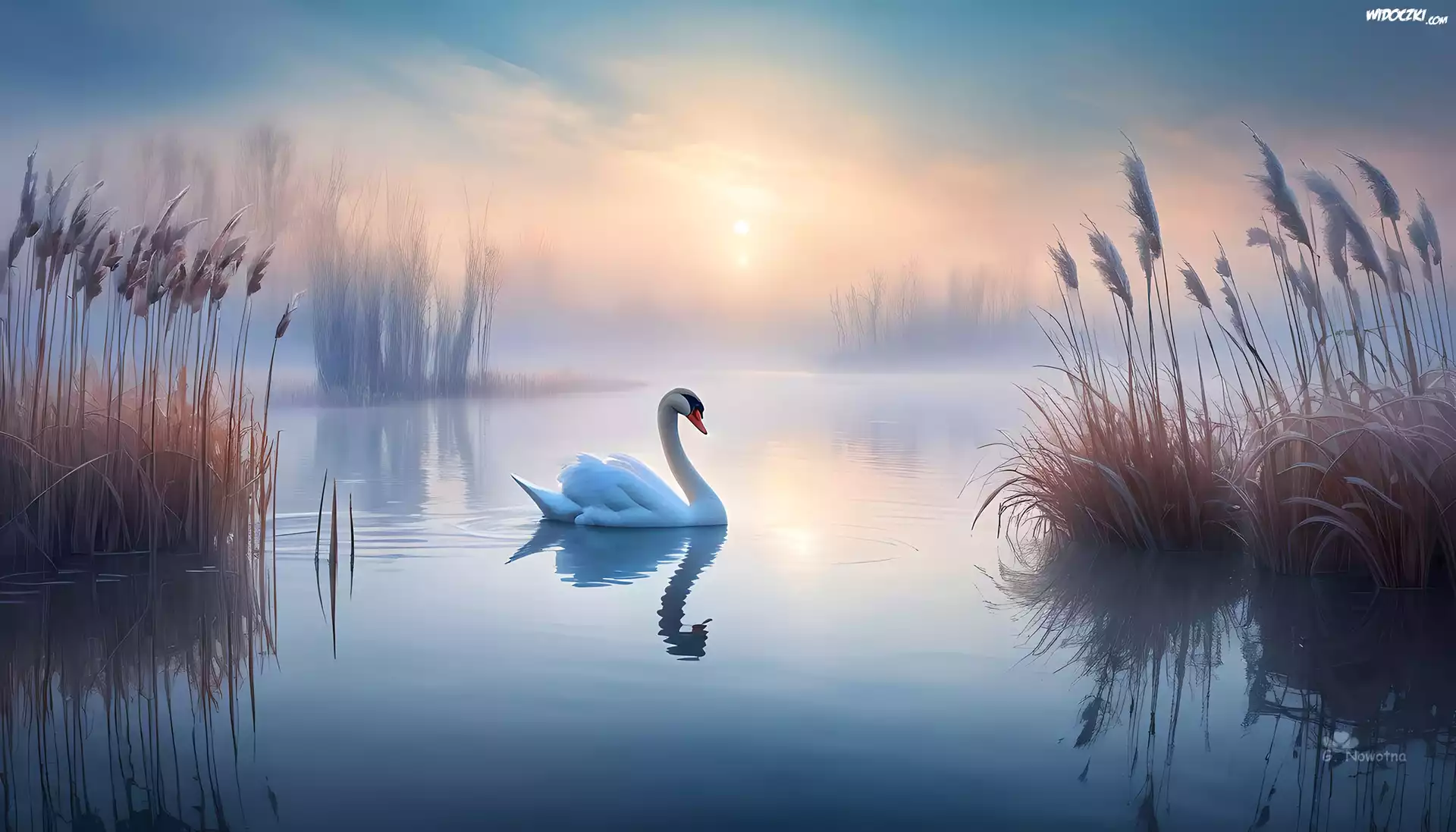 Zdjęcia, Łabędź, Jezioro, Mgła, Szuwary, Grafika