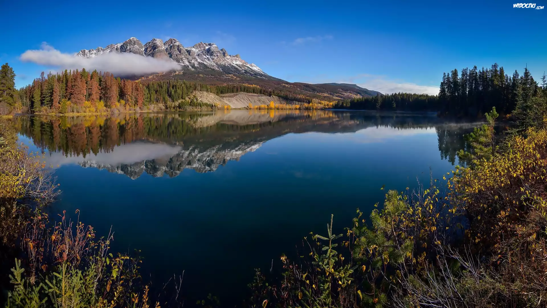 Jezioro, Góry, Lasy, Mgła, Jesień