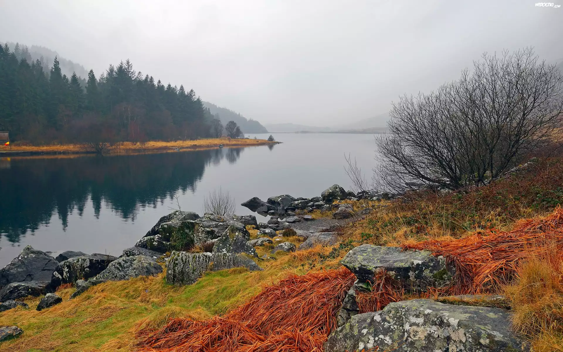 Jezioro, Kamienie, Lasy, Góry, Mgła, Jesień