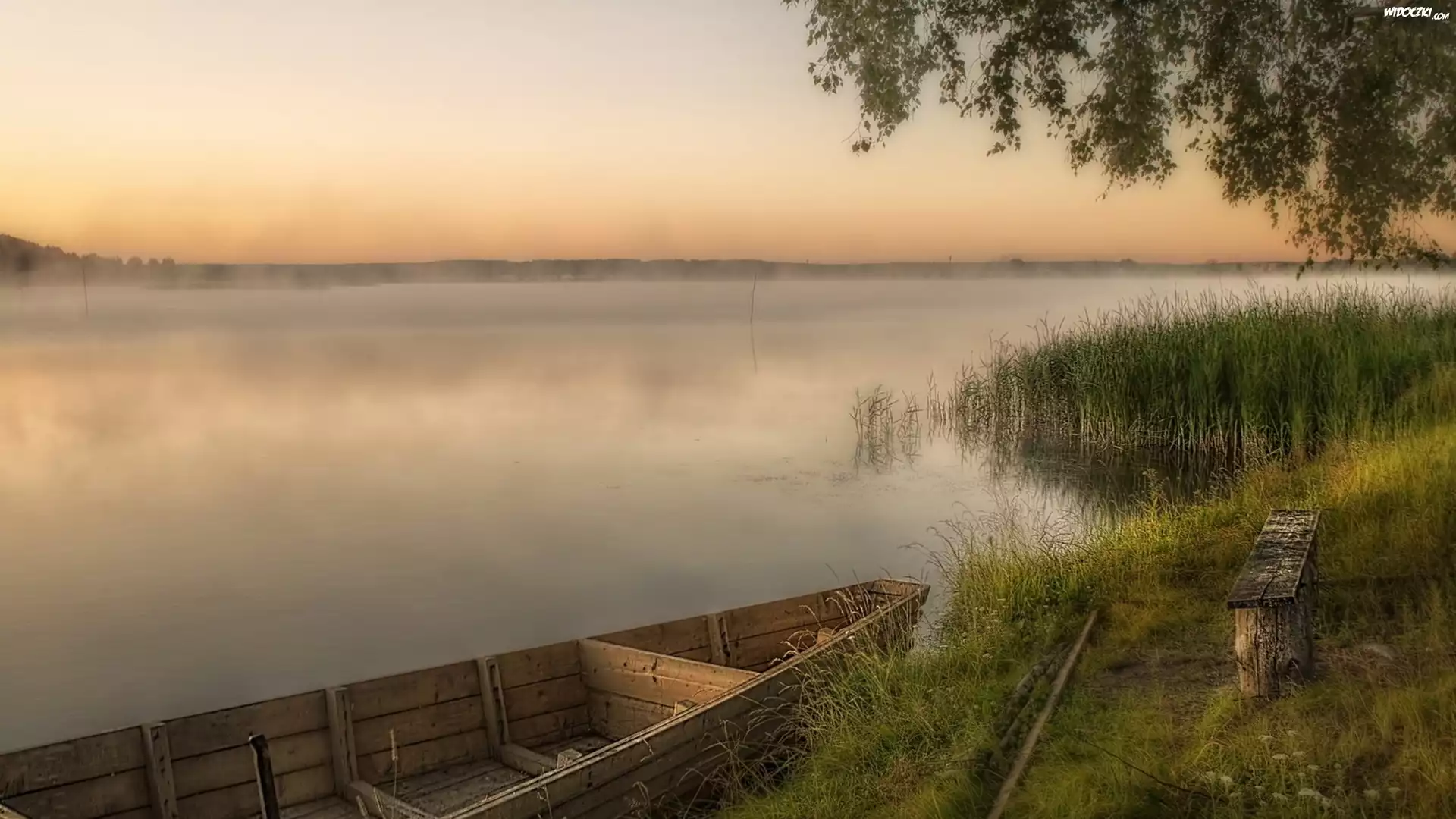 Zdjęcia, Jezioro, Łódz, Mgła, Szuwary