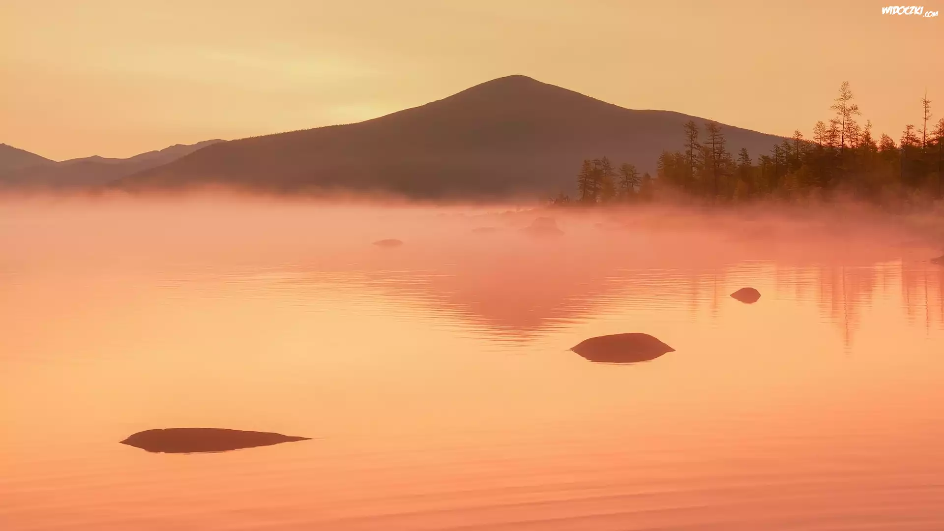 Jezioro, Drzewa, Trawa, Mgła, Góry