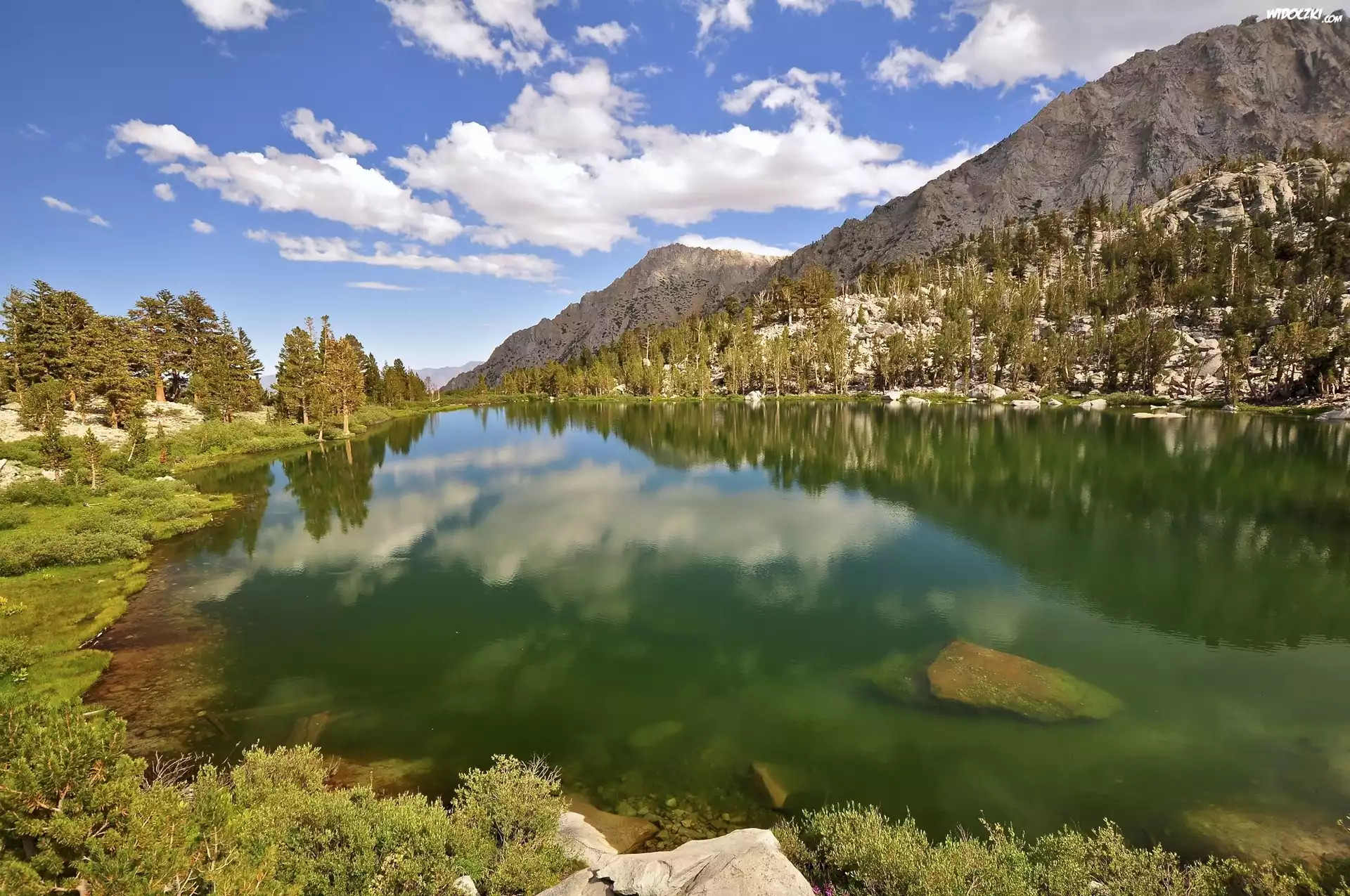 Jezioro Gilbert Lake, Góry Sierra Nevada, Drzewa, Roślinność, Chmury, Miejsce John Muir Wilderness, Stan Kalifornia, Stany Zjednoczone |